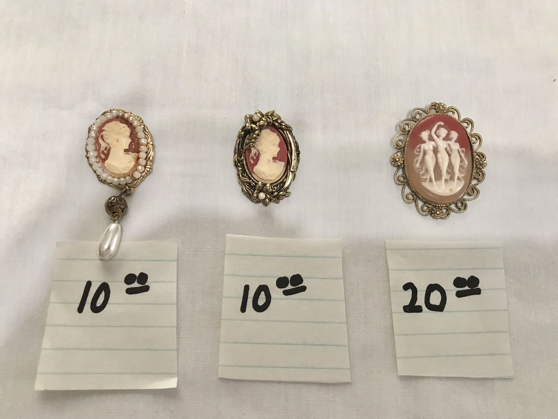 Nice Cameo Pins. (2) head Cameos, $10 each. (1) Dancing Ladies Cameo, $20
