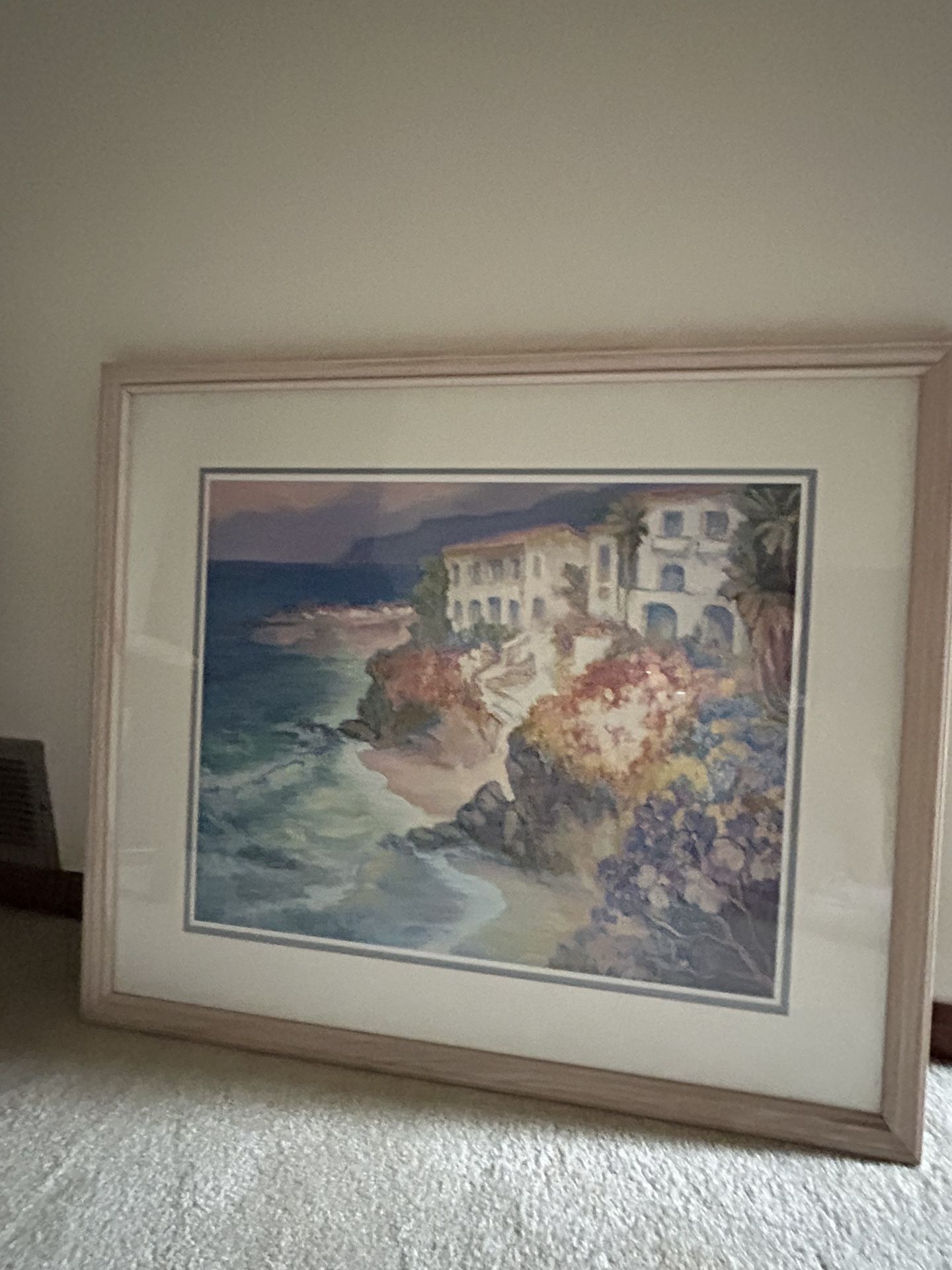 Beautiful framed print with light wood frame with large triple mat. 34"L x29"
