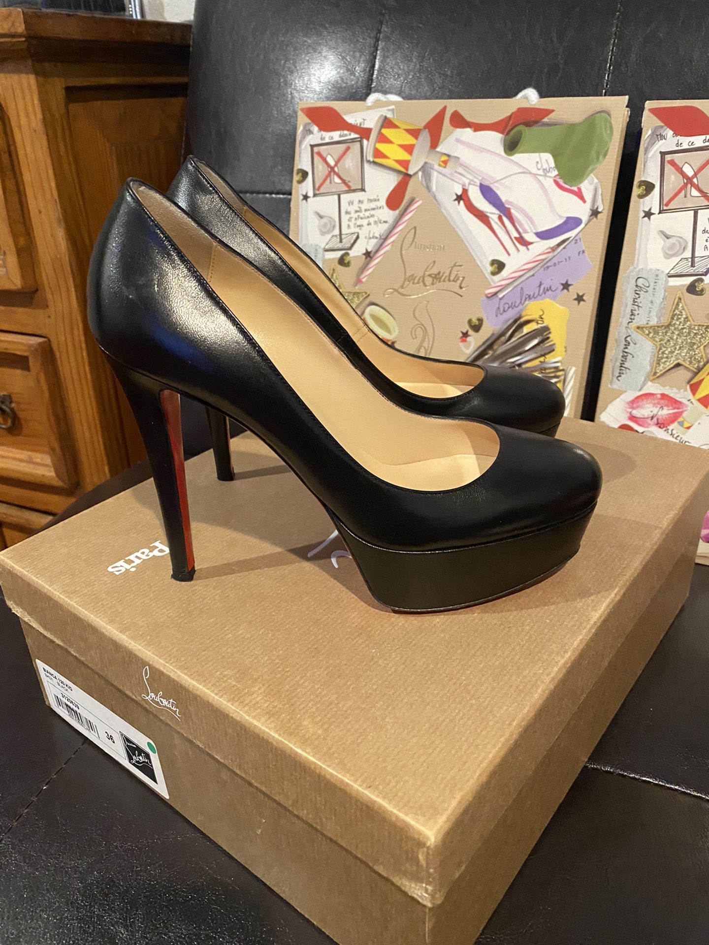 Wore these three times before I got pregnant. Now my feet have grown and cannot fit. Bought these in the Highland Park Village. Comes with original box, sales bag, duster, cleaning cloth, replacement heel tips. Selling or trade in for exact model size 6.5