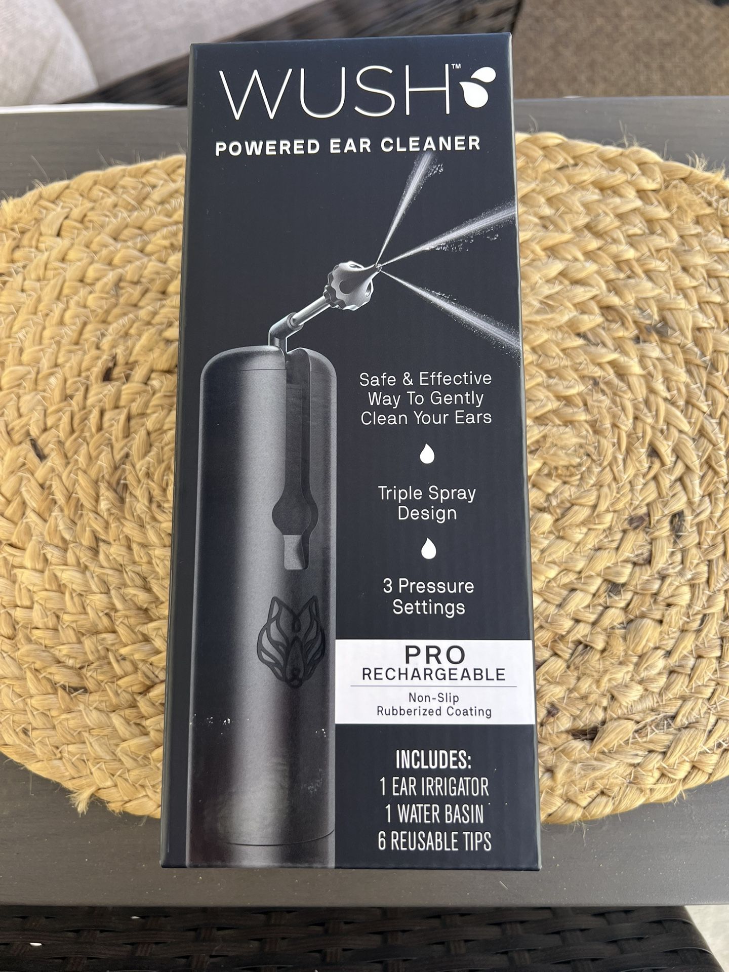 Wush powered ear cleaner comes with 1 ear irrigator, 1 water basin, and 6 reusable tips. The box has never been opened and the product is brand new.