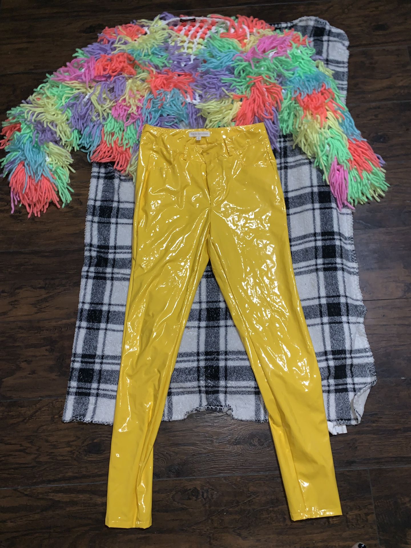 Multicolored crochet shaggy jacket & yellow latex pants
