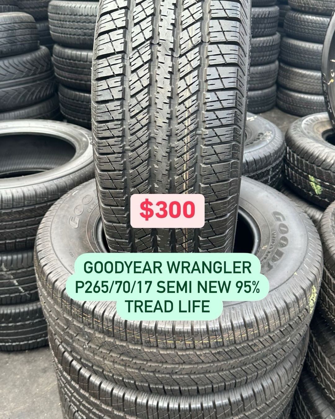 FOUR GOOD USED TIRES 95%TREAD LIFE. 265/70/17 GOODYEAR WRANGLER. BRAND NEW TIRES ANY SIZE. 265/70/17, 265/65/17, 245/70/17, 255/70/18, 235/55/18, 22