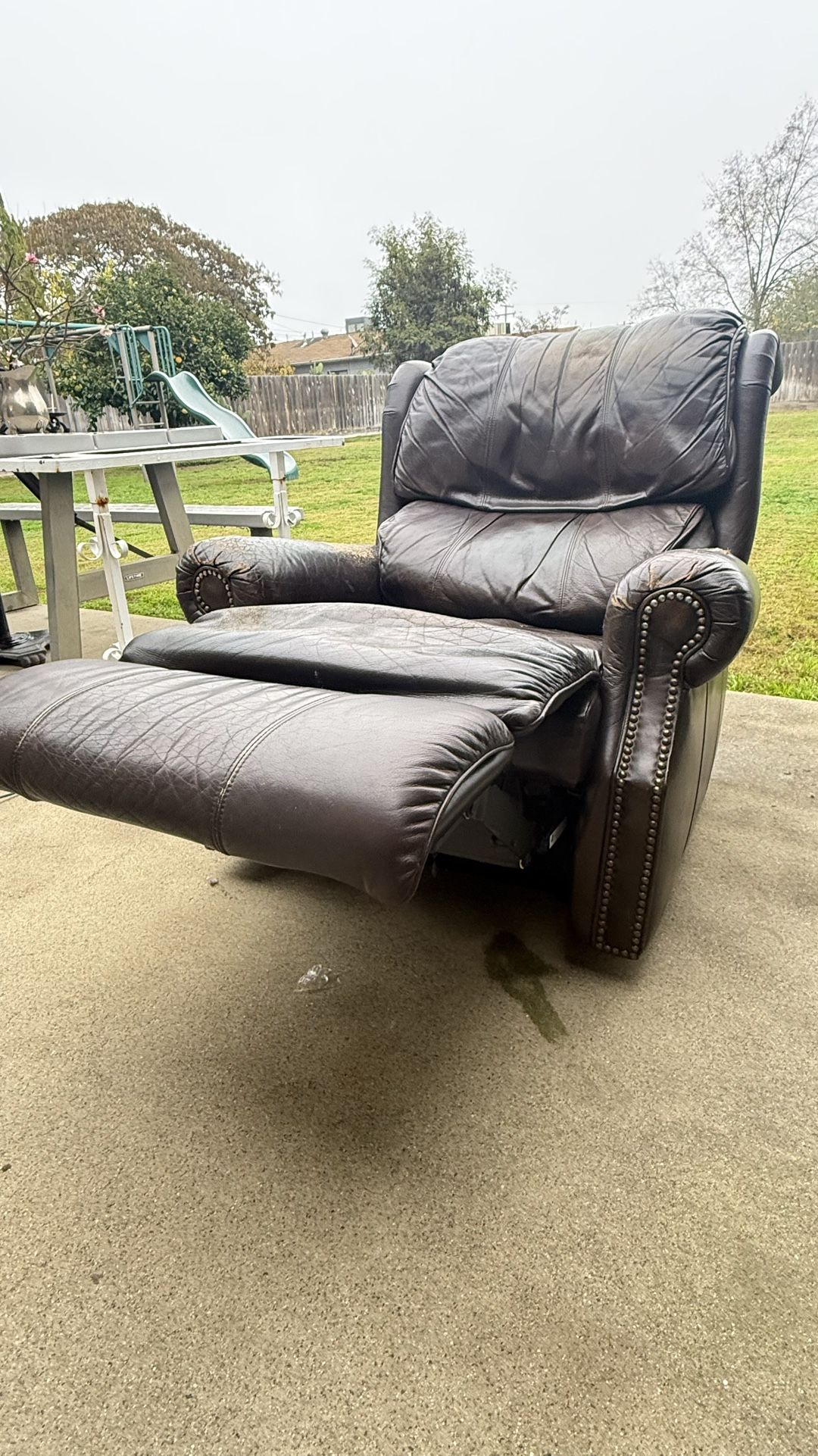 Brown color. Pleather material is worn with usage and a couple holes in the armrests. The mechanism works perfectly and is still comfortable. Just needs some covers on the armrests. Pick up in Tulare only.