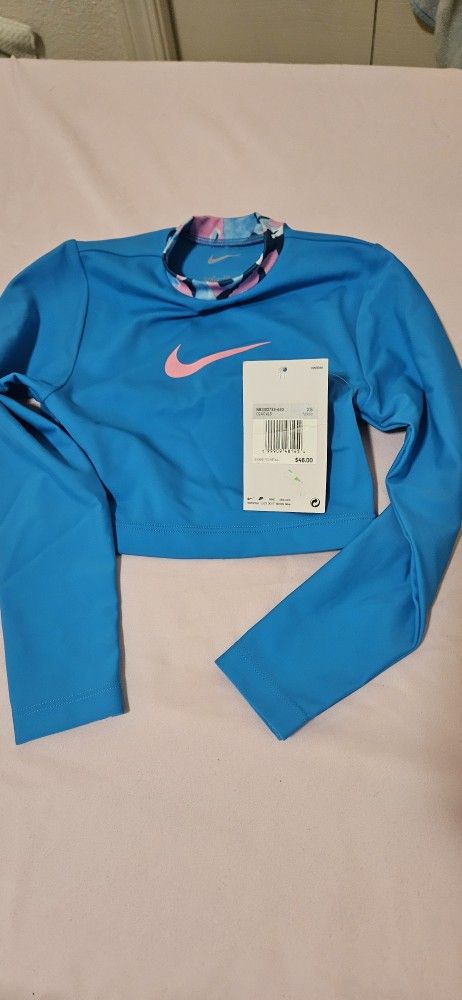 NEW Nike Girls' Shred Camo Long Sleeve Crop Top - Size XS Description: Brand New with Tags! This Nike girls' long-sleeve crop top is perfect for swimming, sports, or active play. It features a vibrant blue color with a stylish pink Nike swoosh and a colorful "Shred Camo" pattern on the interior collar. Size: Girls' X-Small (XS) Condition: New with original tags (MSRP $46.00) Key Features: Comfortable long sleeves for extra coverage and sun protection Trendy cropped length Soft, durable tricot fabric Vibrant blue colorway with pink and multicolor accents Perfect for a young athlete looking for both style and performance. Asking for a fair price—open to reasonable offers!