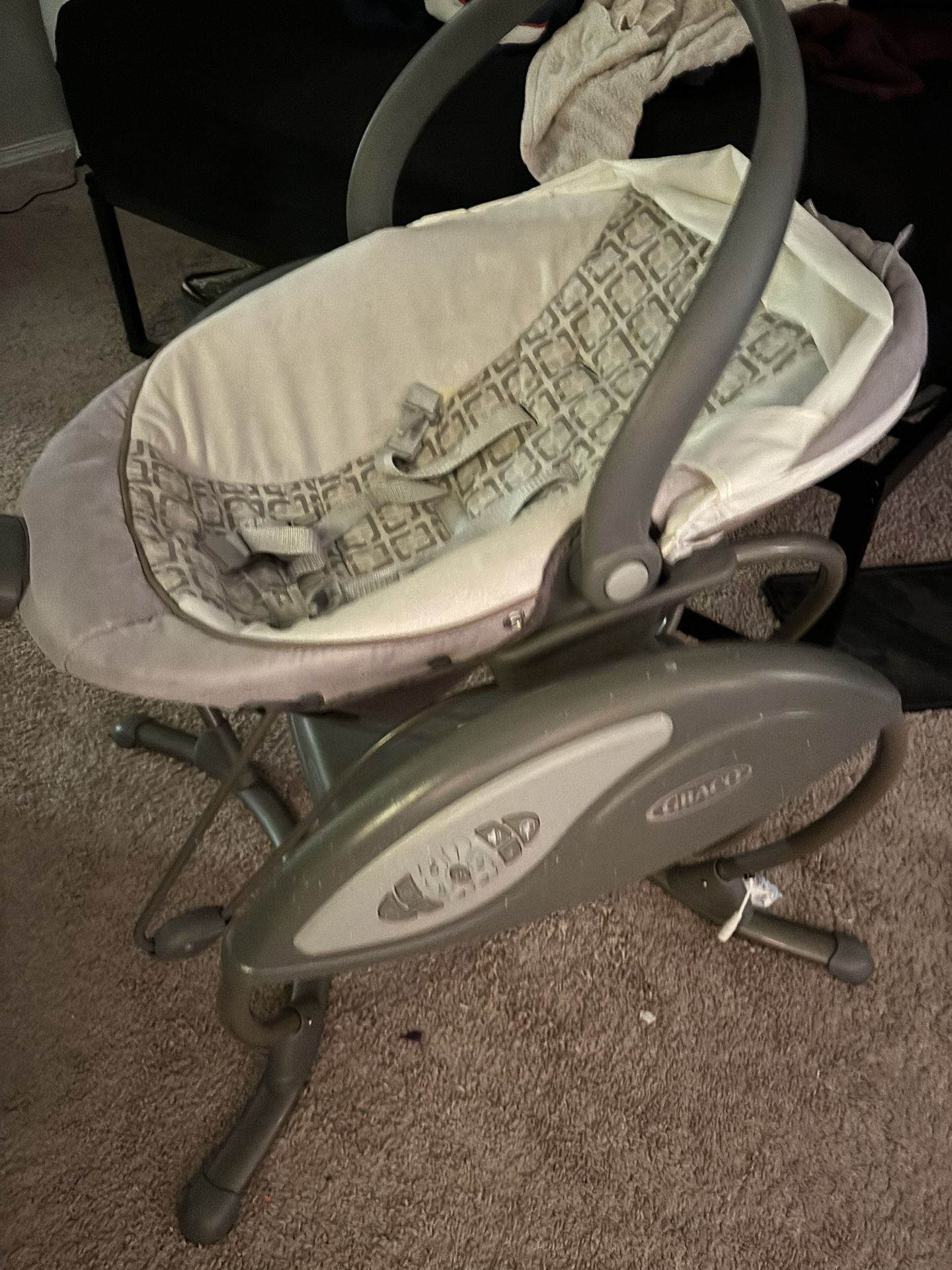It’s plugs in and rocks as well as plays music. Perfect for newborns and infants. Our boys out grown it.