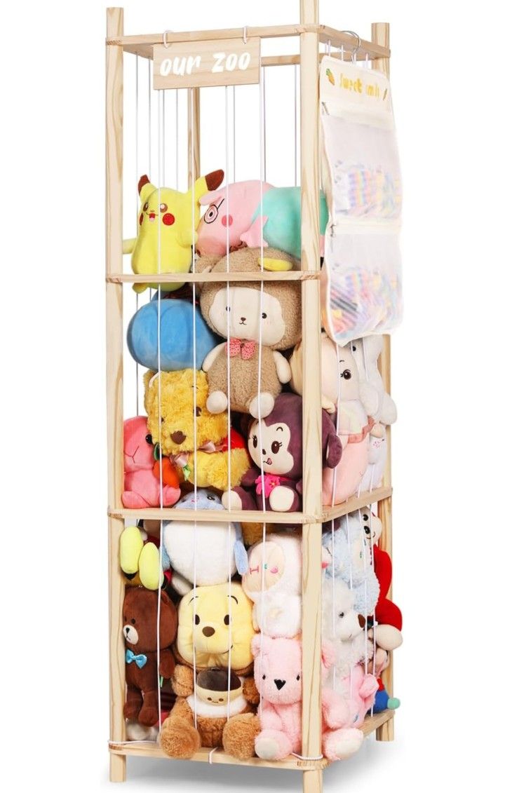 Stuffed Animal Storage Organizer, Large Wooden Zoo Toy Holder with Pockets, Plushie, Stuffy,Toy Storage for Kids Room, Playroom, Bedroom(Natural Large