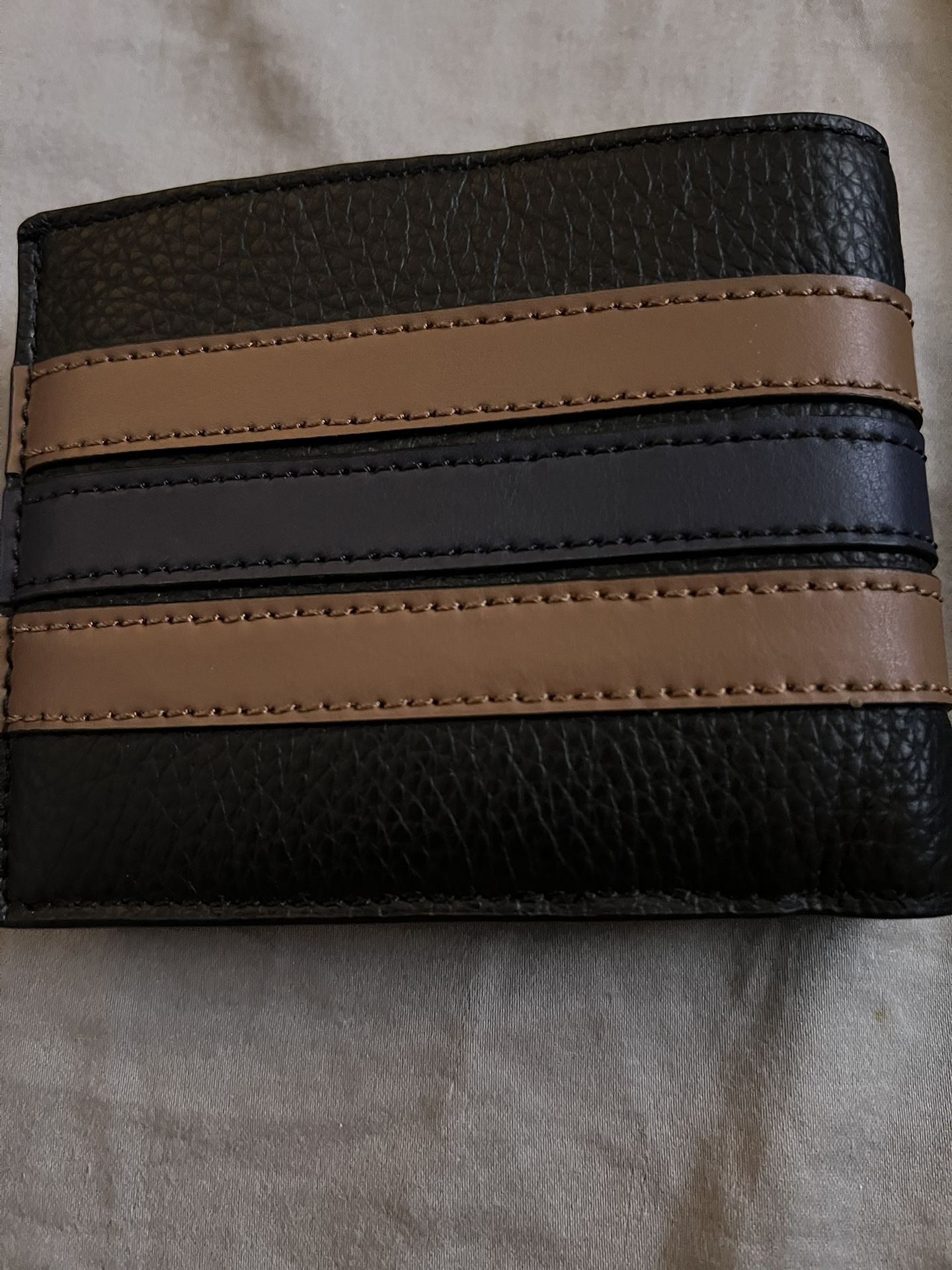 Brand new. Never used. No box. Refined pebble leather and smooth leather Eight credit card slots Full-length bill compartments Removable insert with ID window and two credit card slots 4 1/4″ (L) x 3 3/4″ (H) x 3/4″ (W)