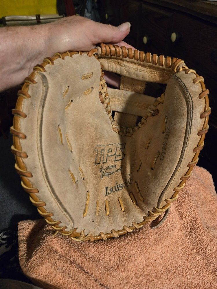 I've got a lefthand Softball Catchers Mitt, TPS model number GTPS-DM. This is a lefthand throw righthand catch mitt. The web and both pinky & thumb spirals have been restrung & thumb side has been reseemed. It's in good shape. There is ink on the back in 2 places(see photos) This is a Softball glove but can also be used to play catch with. The ball is not included with purchase, it's to show how well it fits in the glove. Check out my other gloves & mitts I am selling. I am willing to consider taking other gloves in trade.