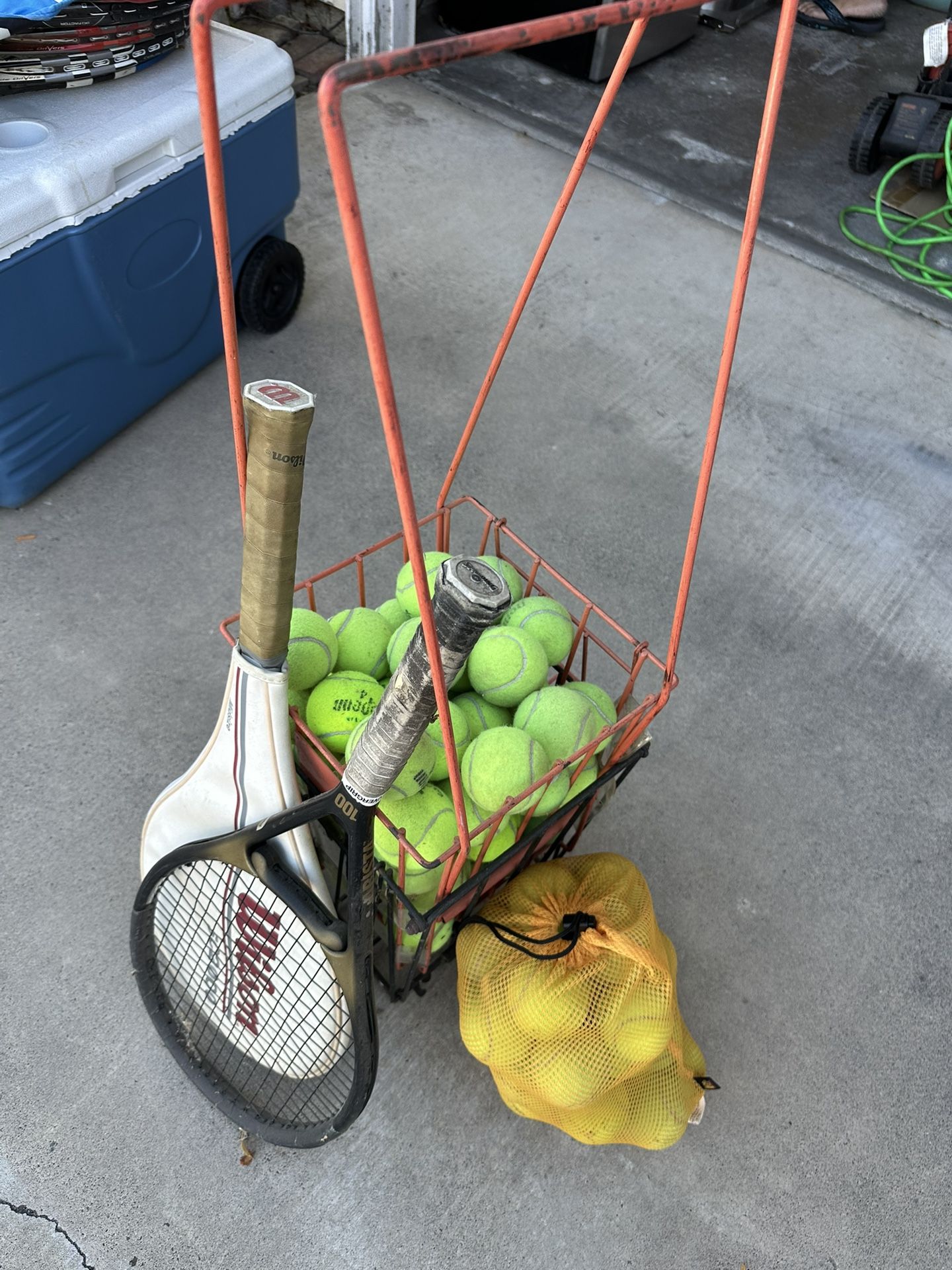 Complete tennis starter/practice set perfect for a home court or coaching! • Includes a sturdy metal tennis ball hopper cart with handles. • 50+ tennis balls included (mixture of conditions). • Two additional Wilson tennis rackets (one with cover). • Great for drills, serving practice, or family fun. Check my other listings for premium Babolat and Wilson K Factor rackets. Can do a bundle deal for everything!