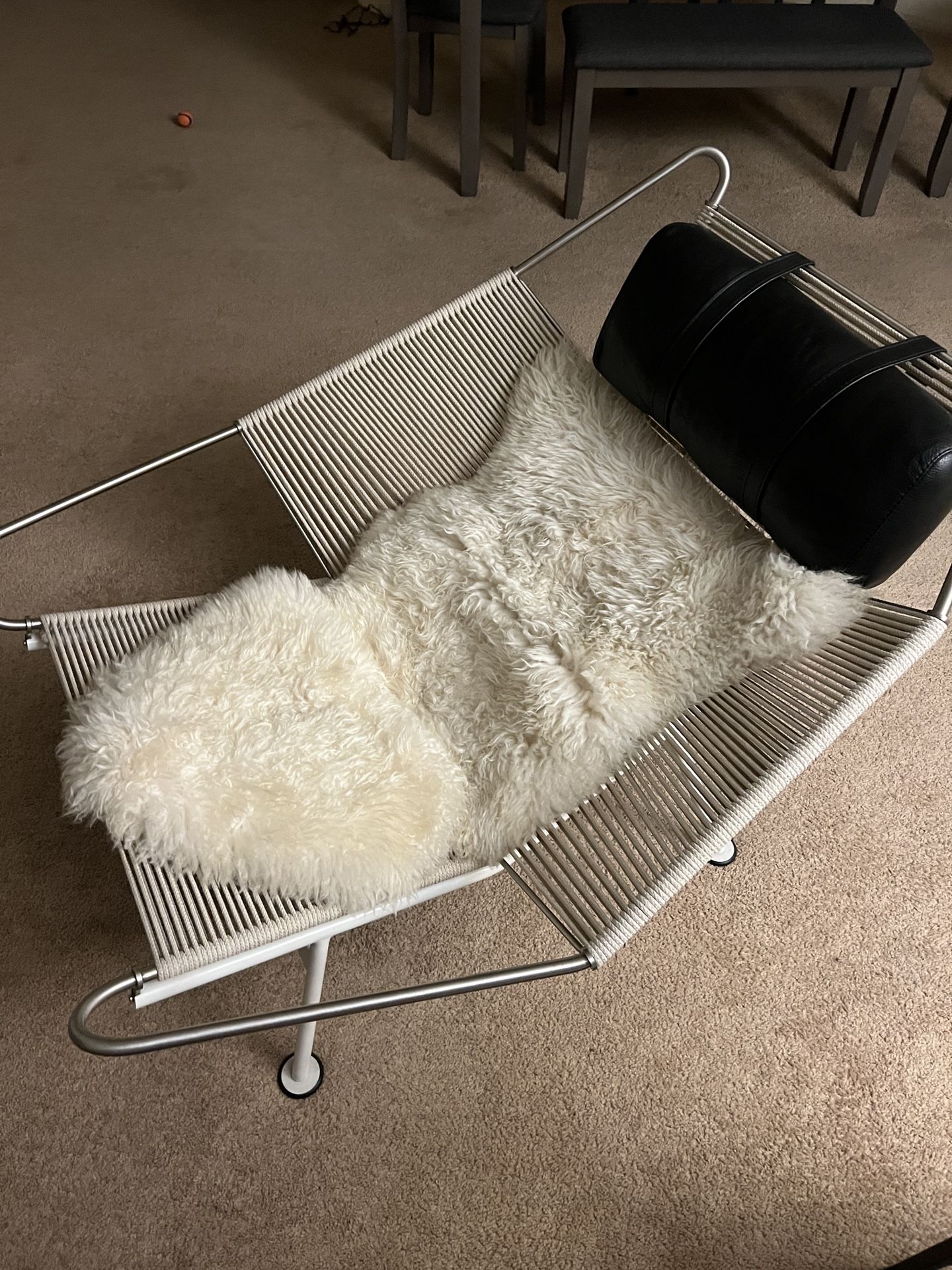 Elevate your living space with this stylish and comfortable lounge chair. The eye-catching design features a sturdy metal frame, a woven rope seat, and a plush sheepskin throw for added warmth and comfort. A black leather headrest cushion completes the look and provides excellent neck support. The chair is in great condition with minimal signs of wear, as shown in the photos. It’s perfect for relaxing with a book, working from home, or adding a statement piece to your décor. • Condition: Gently used, clean, and well cared for • Includes: Chair, removable sheepskin throw, and black headrest cushion • Color: Neutral tones with chrome frame and cream-colored seat • Location: Studio city (pickup only) • Price: $230 (cash only) Feel free to message me if you have any questions or would like to come see it. Serious inquiries only—thanks for looking!