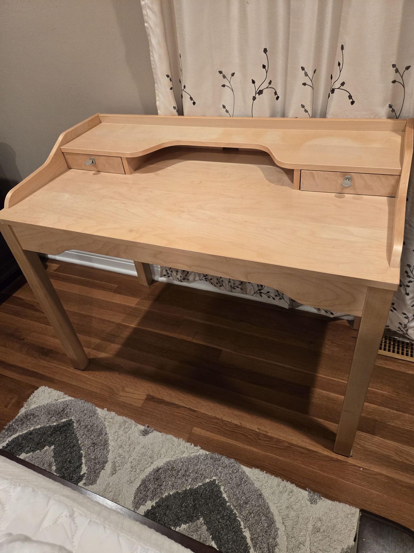 This is a light wood desk with two small drawers. It has a curved front edge and a raised back ledge. The wood has a natural finish and simple silver drawer pulls. 43.5Wx23.5Dx29.5H