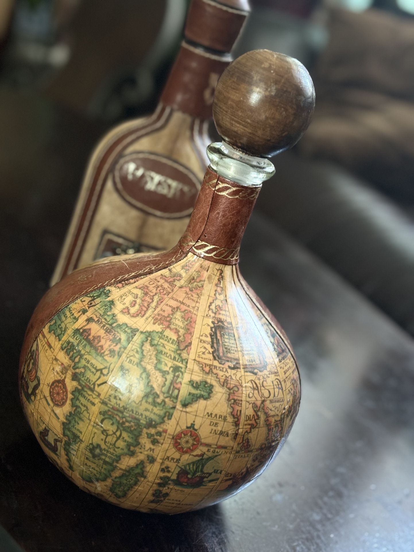 Green Glass Decanter. Wrapped In Leather. Map Of The Old World Italy . 10.5”