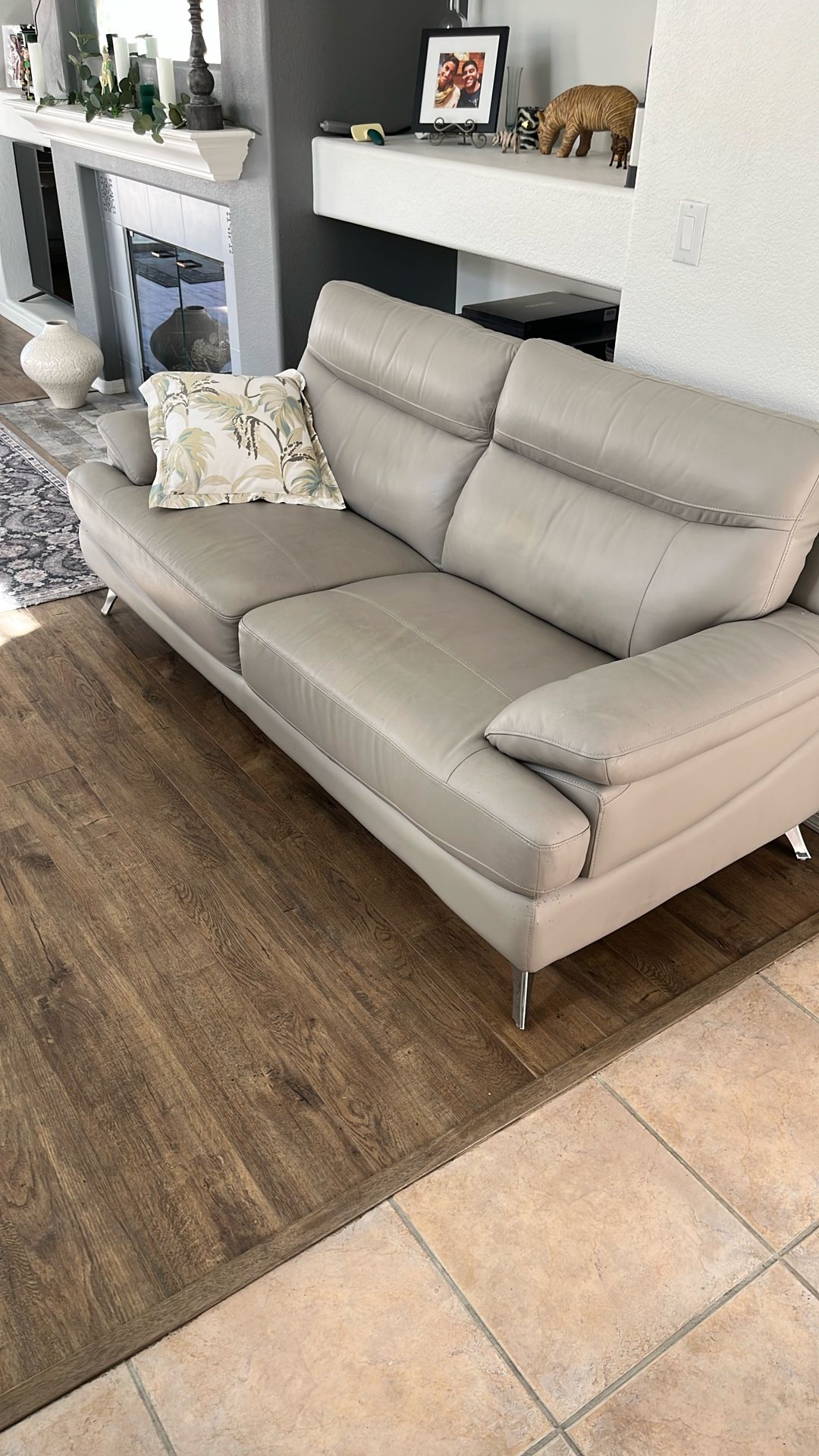 Nice Italian leather sofa, light gray. In great condition with the exception of a few cat scratches.