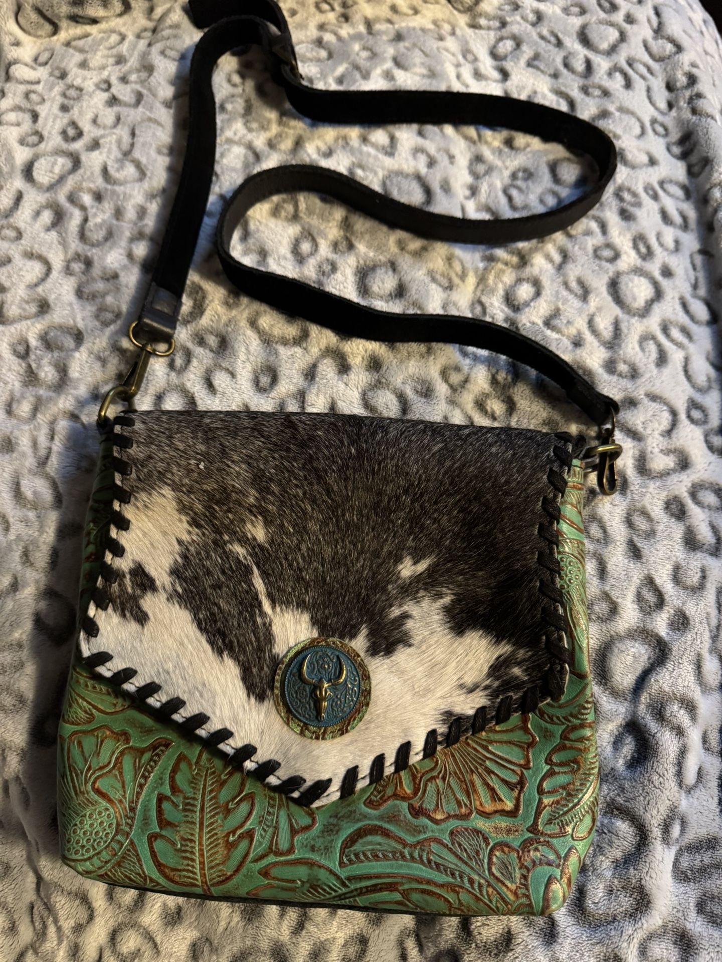 Beautiful Western Cowhide Leather Crossbody Bag with Steer Head Concho on front.