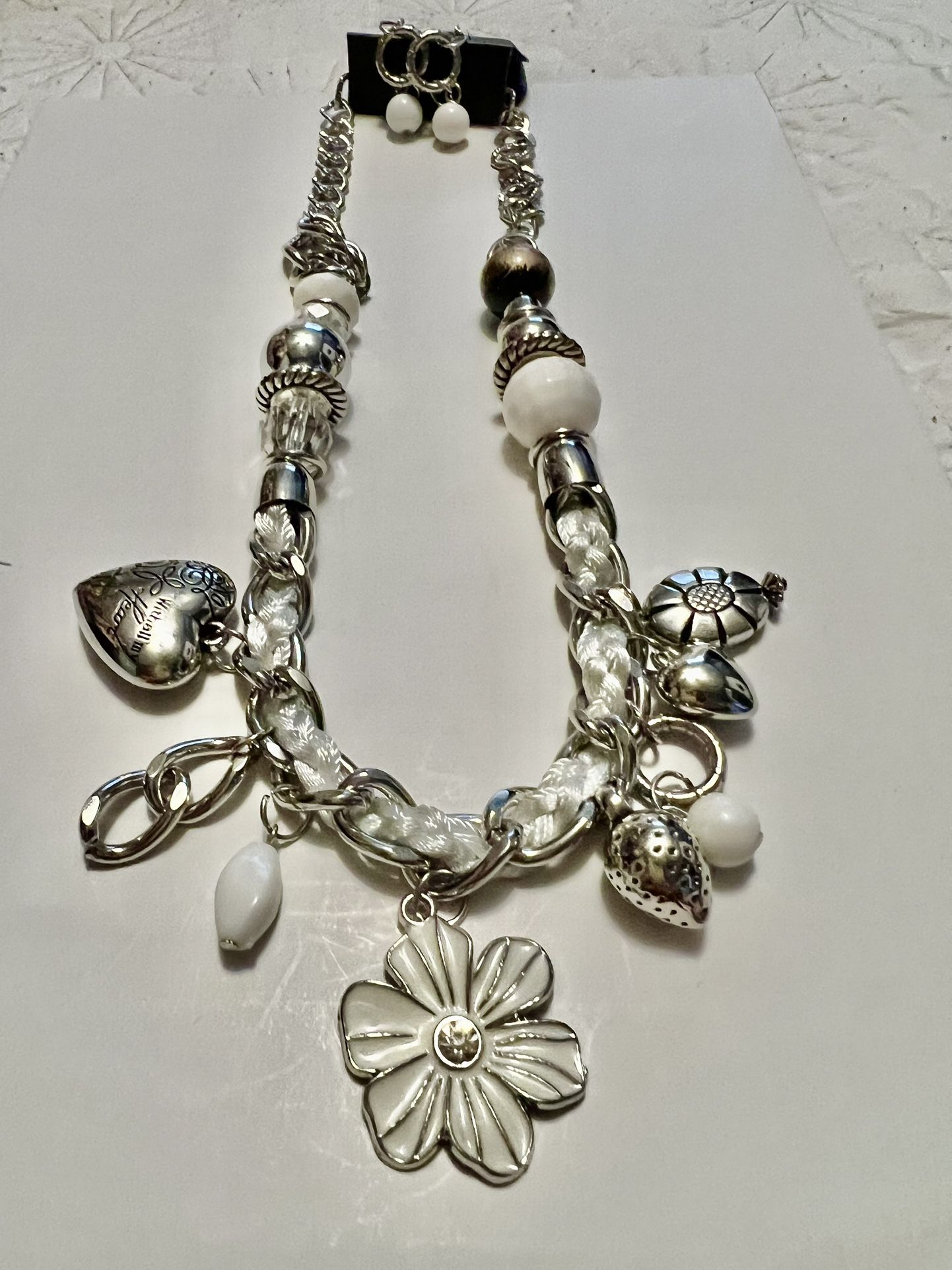 Long silver metal necklace with lots of charms also lays in between the chains. Adjustable must pick up.