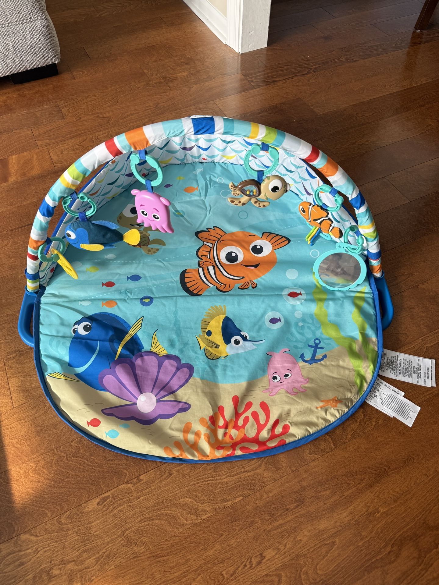 Enjoy a light show with Disney’s Finding Nemo Mr. Ray Activity Gym under the cheerful stingray canopy! The number one Finding Nemo activity gym features twinkly lights to captivate & create immersive experience for baby Kick, wiggle and dance to 25+ minutes of engaging melodies and lights during tummy time; seaweed-inspired prop pillow gives baby extra support during tummy time to encourage neck strength and prevent flat head 6 detachable Finding Nemo-themed tummy time toys entertain and encourage developmental skills: baby-safe mirror, bead chaser, plush toy, texture toy & rattles Play under the sea with Nemo, Dory, Squirt, Crush and Pearl; control music volume & lights with 3 different modes (melody, eye tracking & lights only); Easy to clean with machine washable pad and wipeable toy bar & canopy; powered by 3 AA batteries (not included); suitable for newborns & up; dimensions: 32” x 36” x 18”