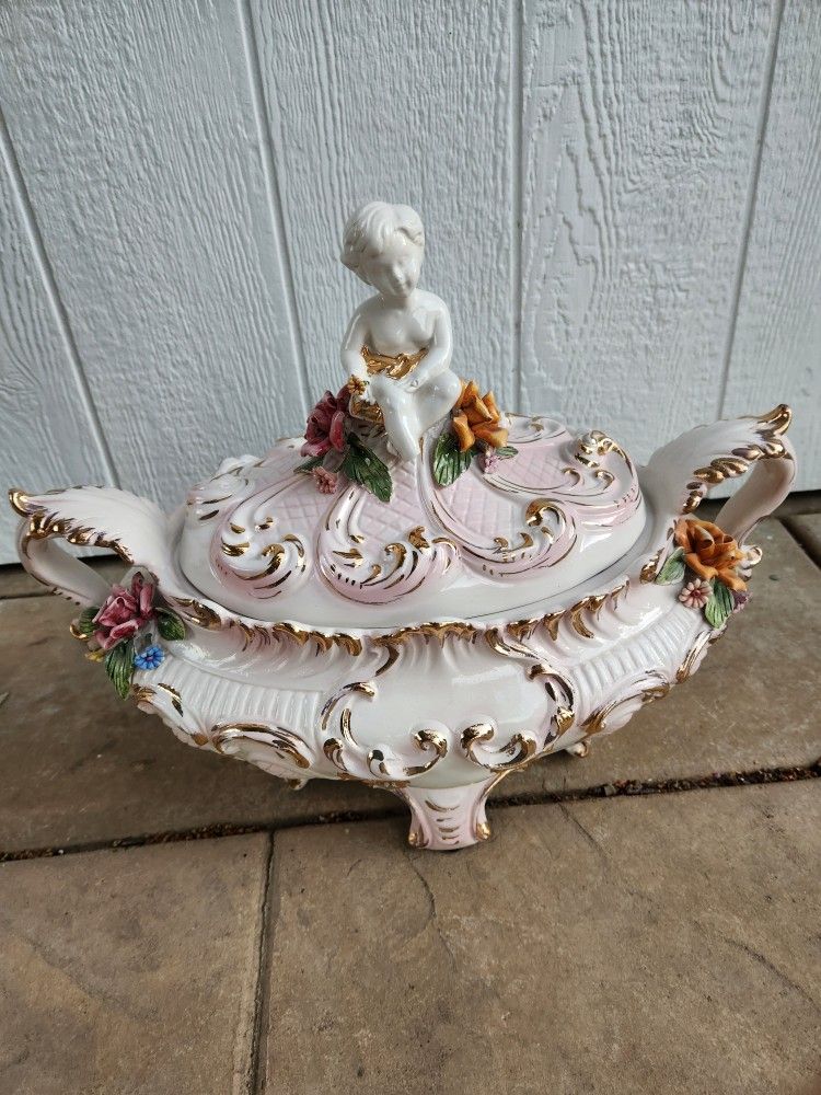 Lovely Capodimonte urn. Adorable cutie sits on top surrounded by flowers. Cutie has broken leg and back side of urn is cracked, but it is not real noticeable. See pictures. 17" long x 15" tall x 9" wide