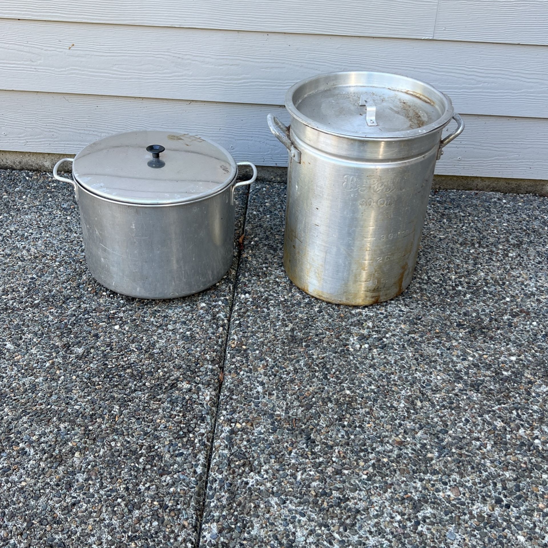 Both haven’t been used much at all but have been in storage for awhile - work great, just need a little scrub and then they are good to go. Two very large pots - one was a turkey frier pot. Porch pick up only.