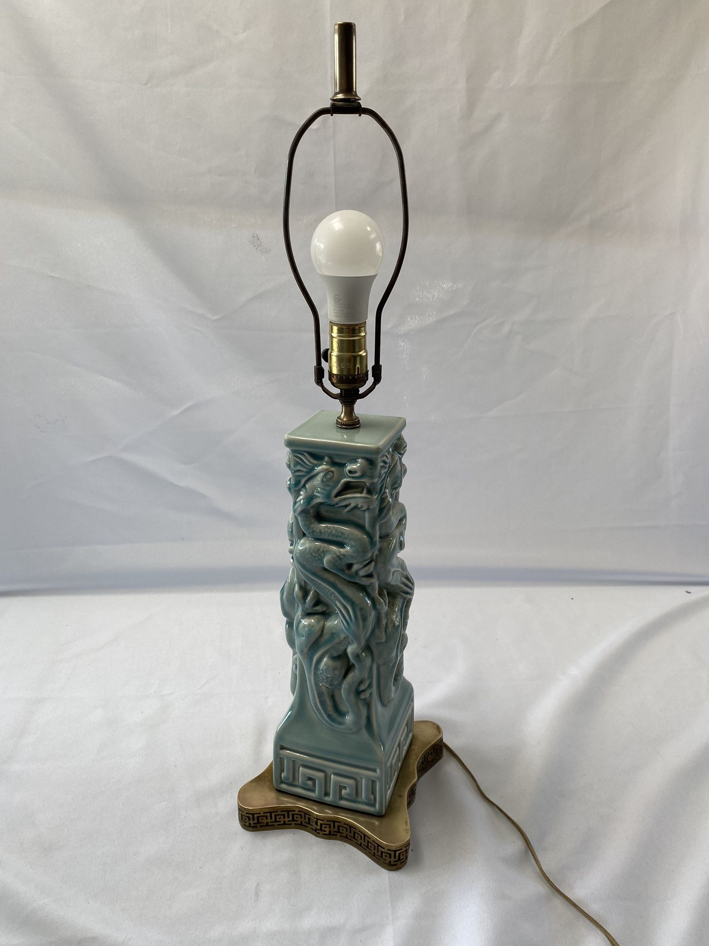One of a kind midcentury lamp with real brass base (under-plate is steel). Jade stained porcelain dragon body. Perfect working condition. Asking $300 OBO