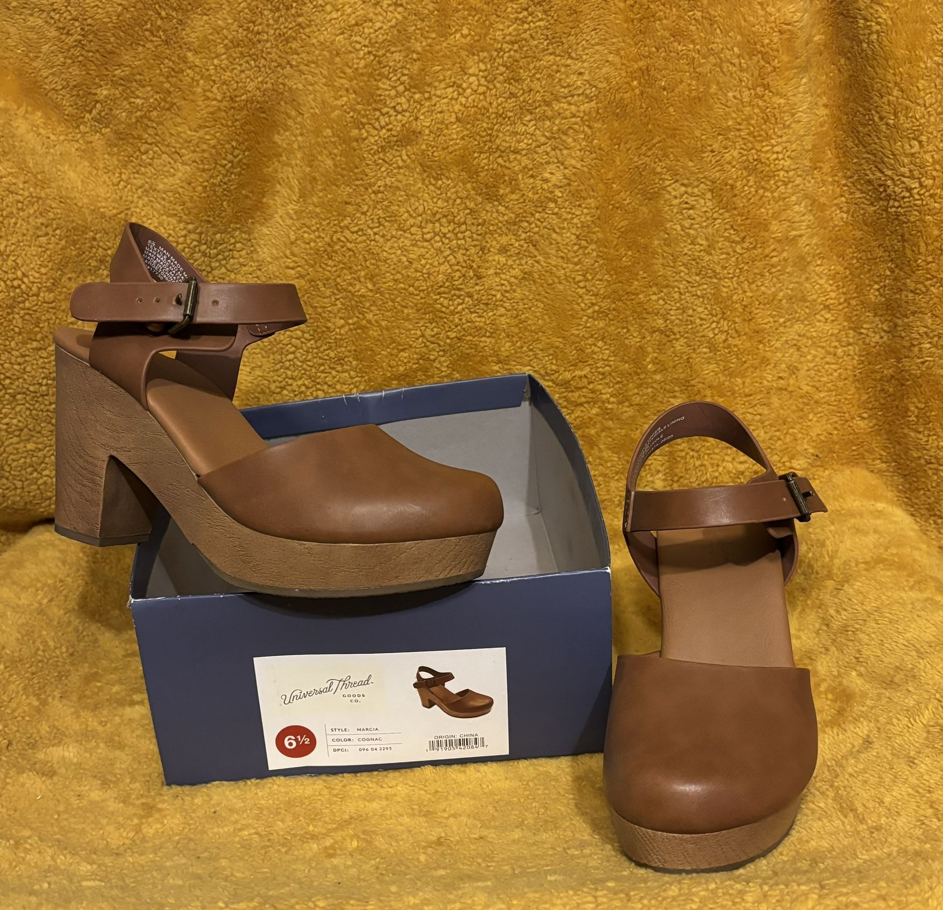 Universal Thread - Cognac/Tan Marcia Heeled Clog Sandals Size: 6 1/2 Brand New in Box Comes with original box but NO lid. Slight wear and tear on box from moving and storage Alternate and possibly cheaper shipping method available. Will be shipped with care as soon as possible I offer one shipping price and bundle deal for other items purchased on my page *CROSS POSTED IN OTHER SALES APPS*