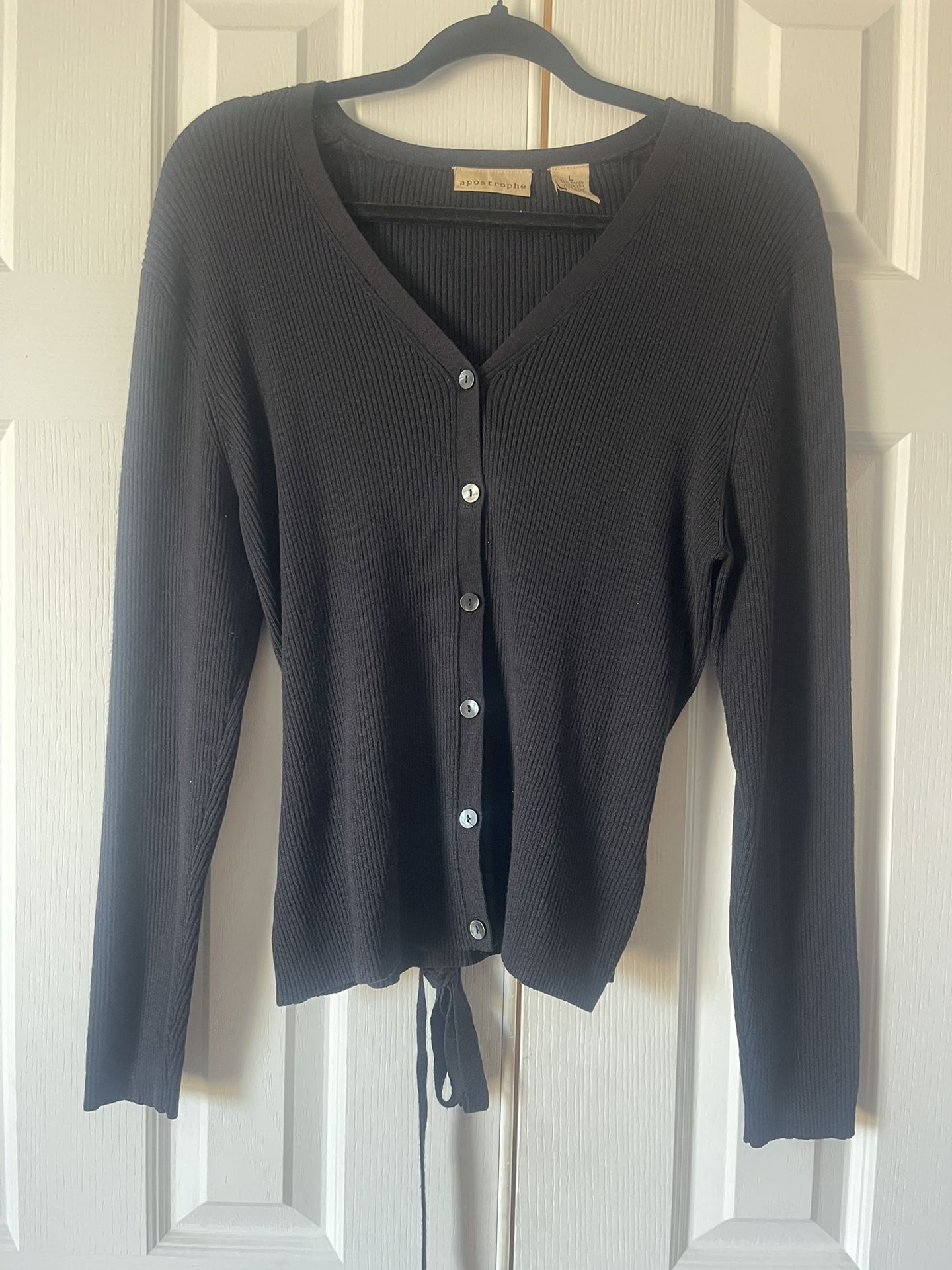 Elevate your wardrobe with this Apostrophe cardigan sweater in size LARGE. The classic black color and solid pattern make it a versatile piece to wear all year round. The V-neckline and asymmetrical sleeves add a touch of uniqueness to the sweater, while the long sleeves provide warmth during cooler seasons. Crafted from a blend of nylon and rayon, this sweater features stretch for a comfortable fit and is suitable for all seasons. The bottom-up design and open style make it easy to layer over your favorite outfit. Perfect for any occasion, this Apostrophe cardigan sweater is a must-have addition to your collection. Pre owned / excellent condition / $25OBO