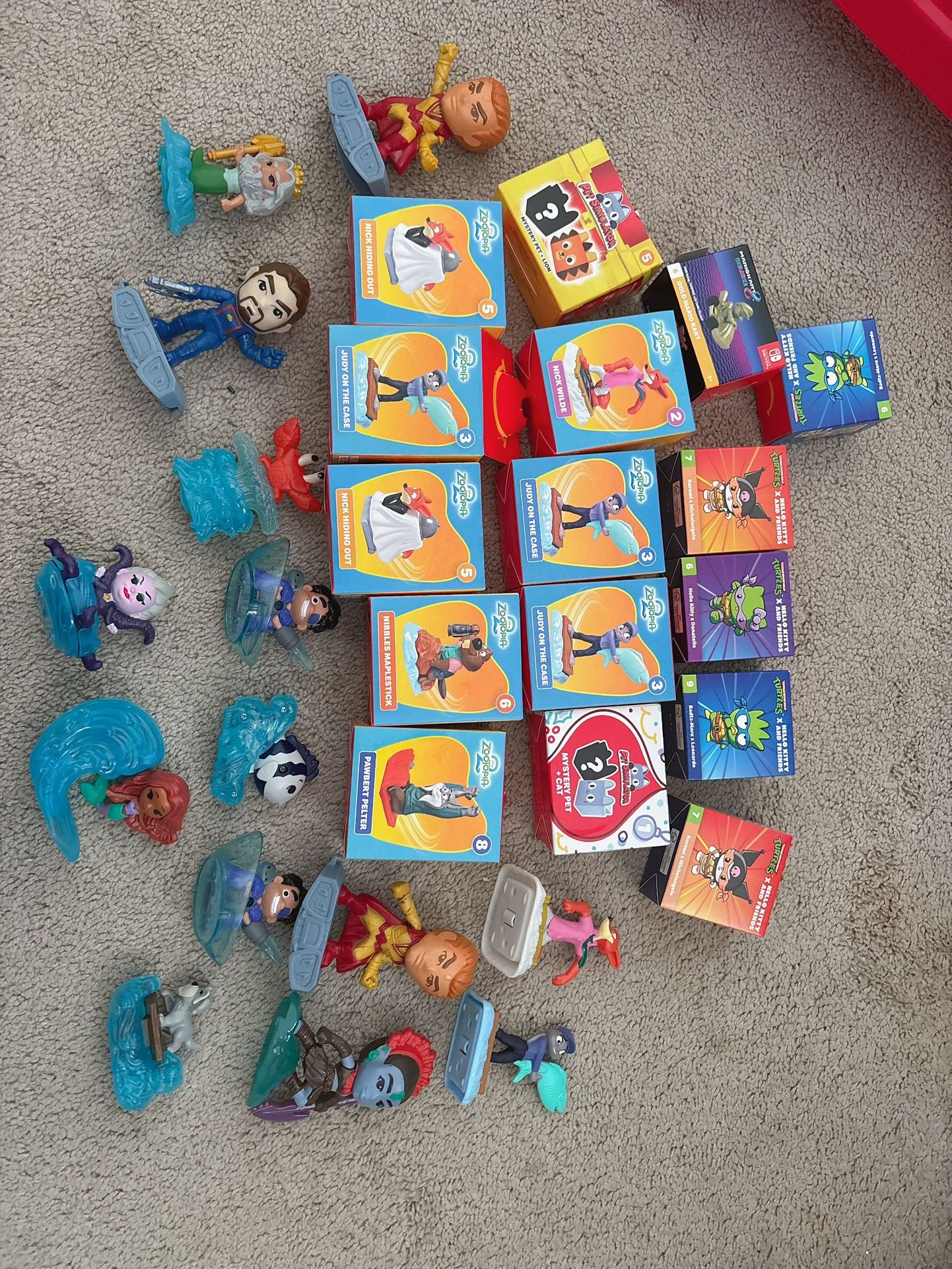 McDonald kid toy Adventur zootopia hello kitty and friends mariokart good condition Excellent condition. Like new. Price $2/ea Comes from pet
