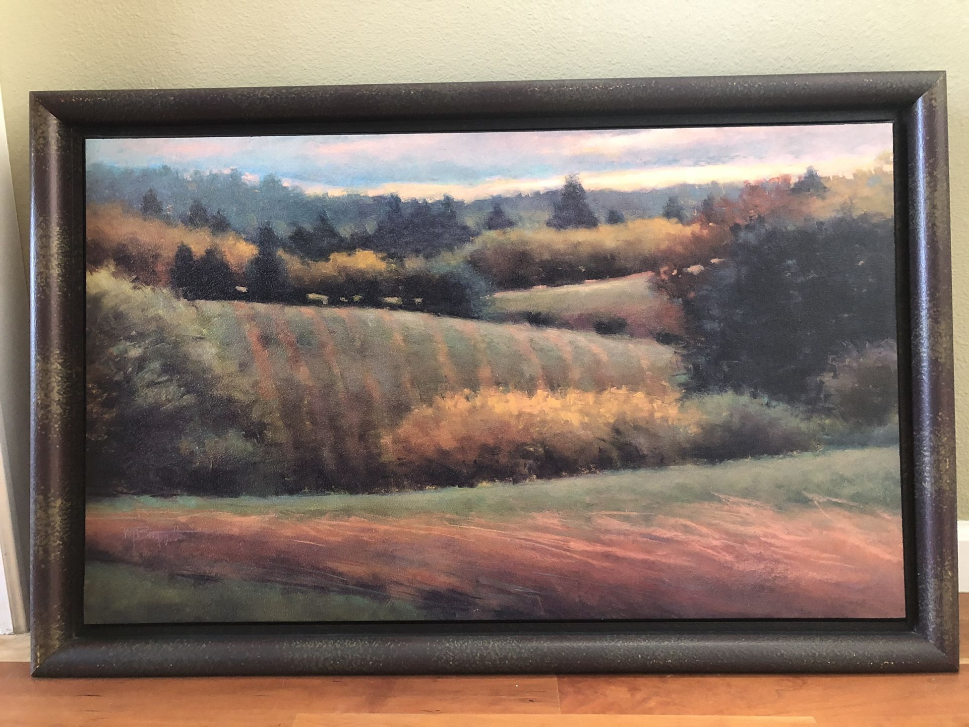 Canvas art in custom frame. Beautiful colors in great condition. Like new! 23” x 36”