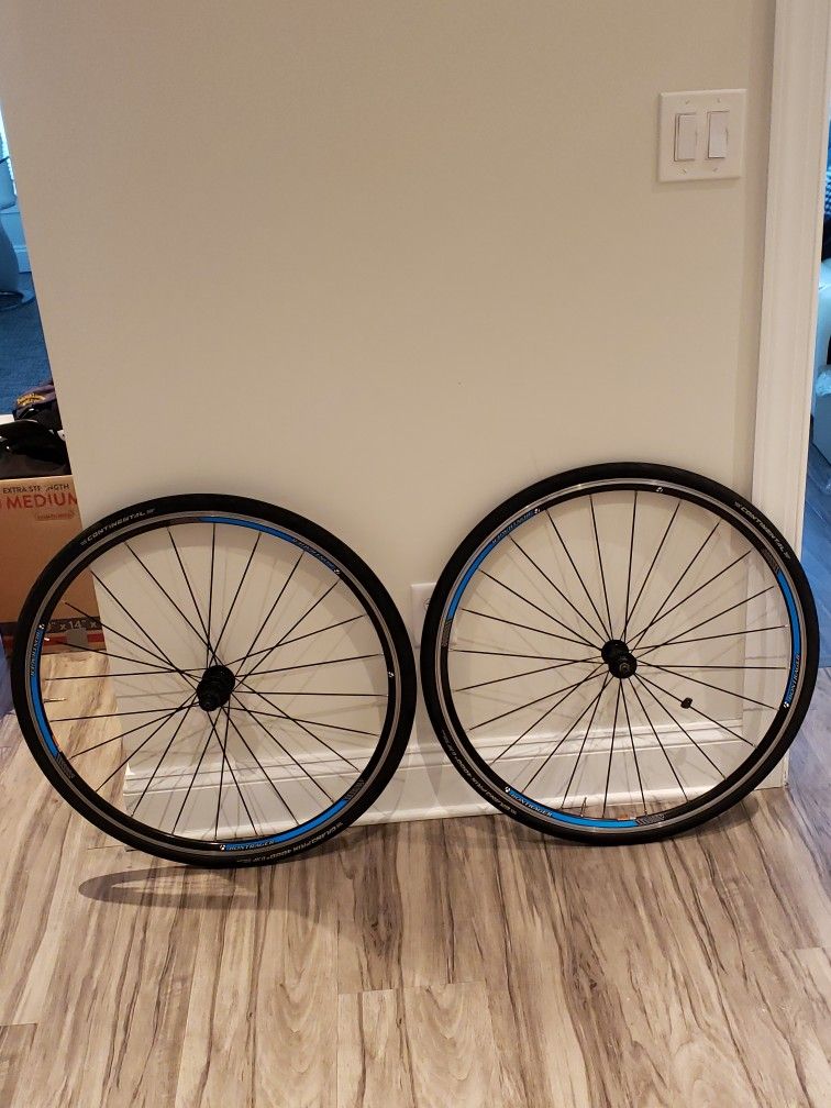 Up for sale is a like new Bontrager Wheelset, rim brake, 622 x 14 ALUMINUM wheel set with Continental Grand Prix 4000s IIs 25mm clincher tires. NO CASSETTE. NO SKEWERS, 10 Speed Shimano hub in good condition. All parts have been housed in a smoke free and pet free environment. $125 OR BEST OFFER PICKUP/MEET UP in Alexandria ,Virginia CASH ONLY