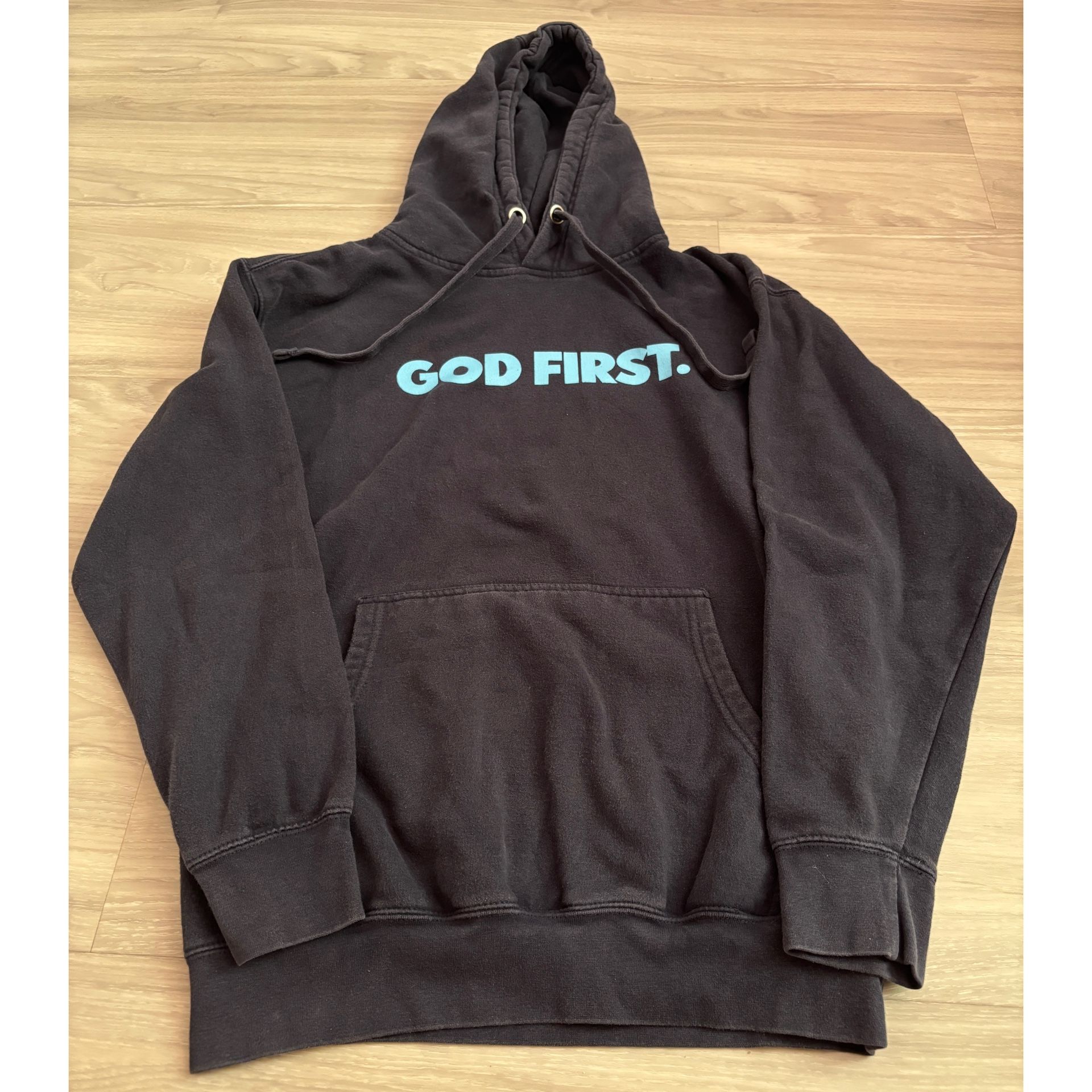 Black Cotton Heritage hoodie with bold “GOD FIRST.” lettering in blue. • Size: Medium • Chest: 20” flat, Sleeve: 27” flat • 65% cotton / 35% polyester • Good condition, no major flaws • Soft fleece, drawstring hood, kangaroo pocket Perfect for casual wear, streetwear, or faith-based style.