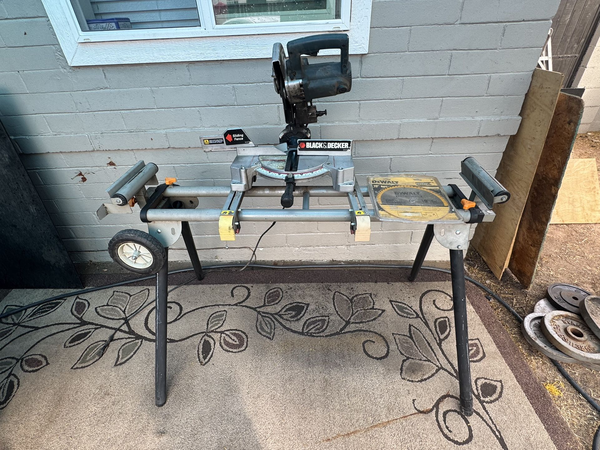 Black+Decker miter saw mounted on a rolling stand. Includes an extra saw blade. Works great overall. We just don’t need it anymore.