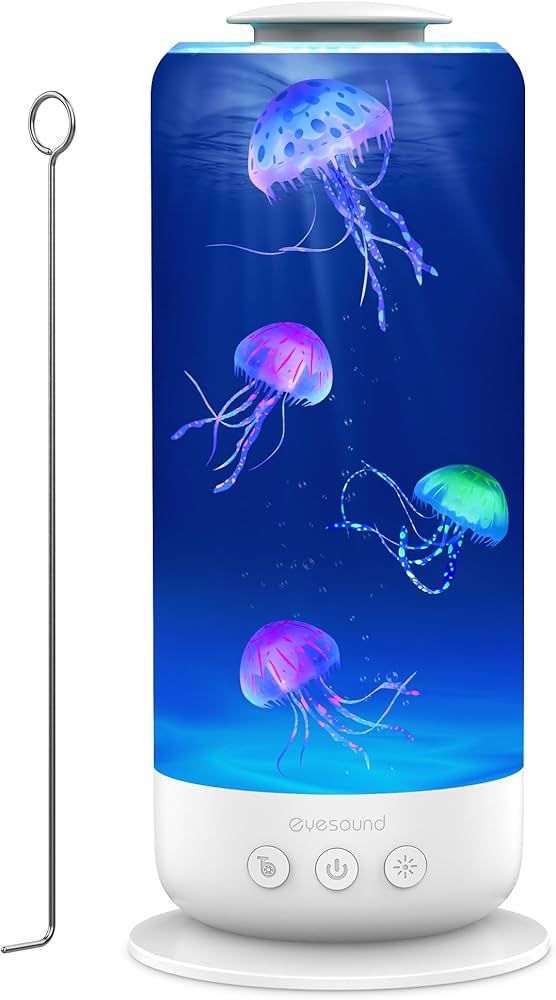 7 Colors & 2 Lighting Modes: Create a soothing ambiance with gradient breathing or static color mode. The lifelike jellyfish simulate real swimming motion inside the tank, transform your space into a mersmerizing undersea world—Perfect for focus, studying, meditation, or relaxation. 3 Flow Speeds & Ultra-Quiet Motor: Customize your jellyfish's swimming speed by adjust from normal, slow, fast to static modes to achieve different visual effect via this jelly fish light lamp. Equipped latest brushless motor (<25dB) with quiet operation,great to help sleep, relief stress,and reduce anxiety. USB-C Powered & Easy to Use: Simply plug and play with the included 1.2m USB-C cable for this led jellyfish light. Works with USB adapters, power banks, laptops, or PC—no extra parts needed. Low maintenance than jelly fish tank aquarium,hassle-free setup and no worrying for short cords. 360° Full-View & Leakproof Design: With a large 2.5L capacity, this jellyfish tank offers plenty of room for jellyfish swimming and a full 360° viewing experience. Rotatable lock lid effectively prevents leakage - no spill, no mess. Eyesound jellyfish lamp designed a heavier and widened base for stable & safer use. Ideal Gift Idea for all ages: Use this jellyfsh lamp as an mood lamp or night light in your home, office, bedroom, living room or desktop. A perfect gift for Christmas, birthdays, or holidays—for kids, teens, adults, and ocean lovers.
