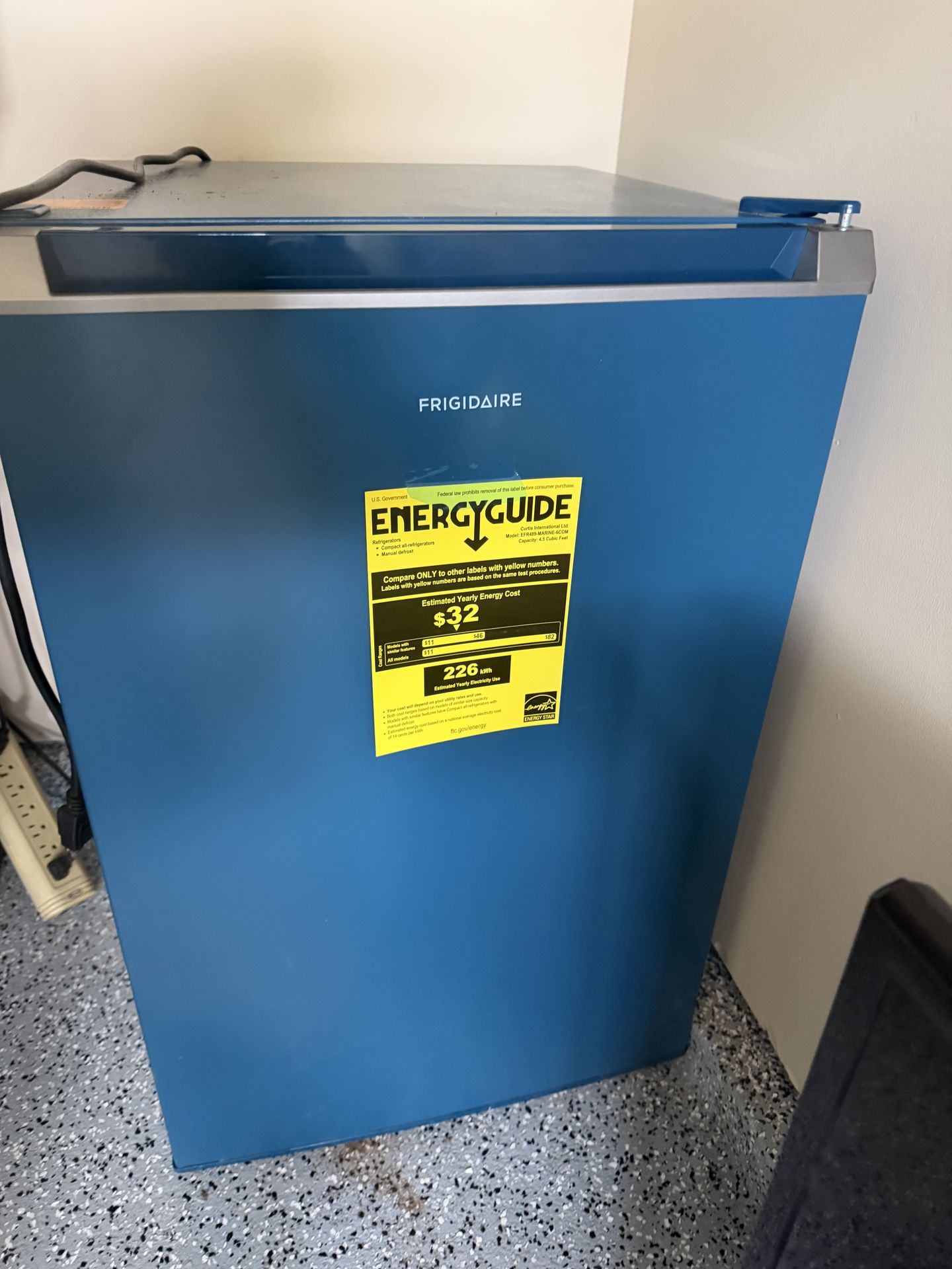 New small fridge perfect for room or garage. Just a small dent on the corner of the door