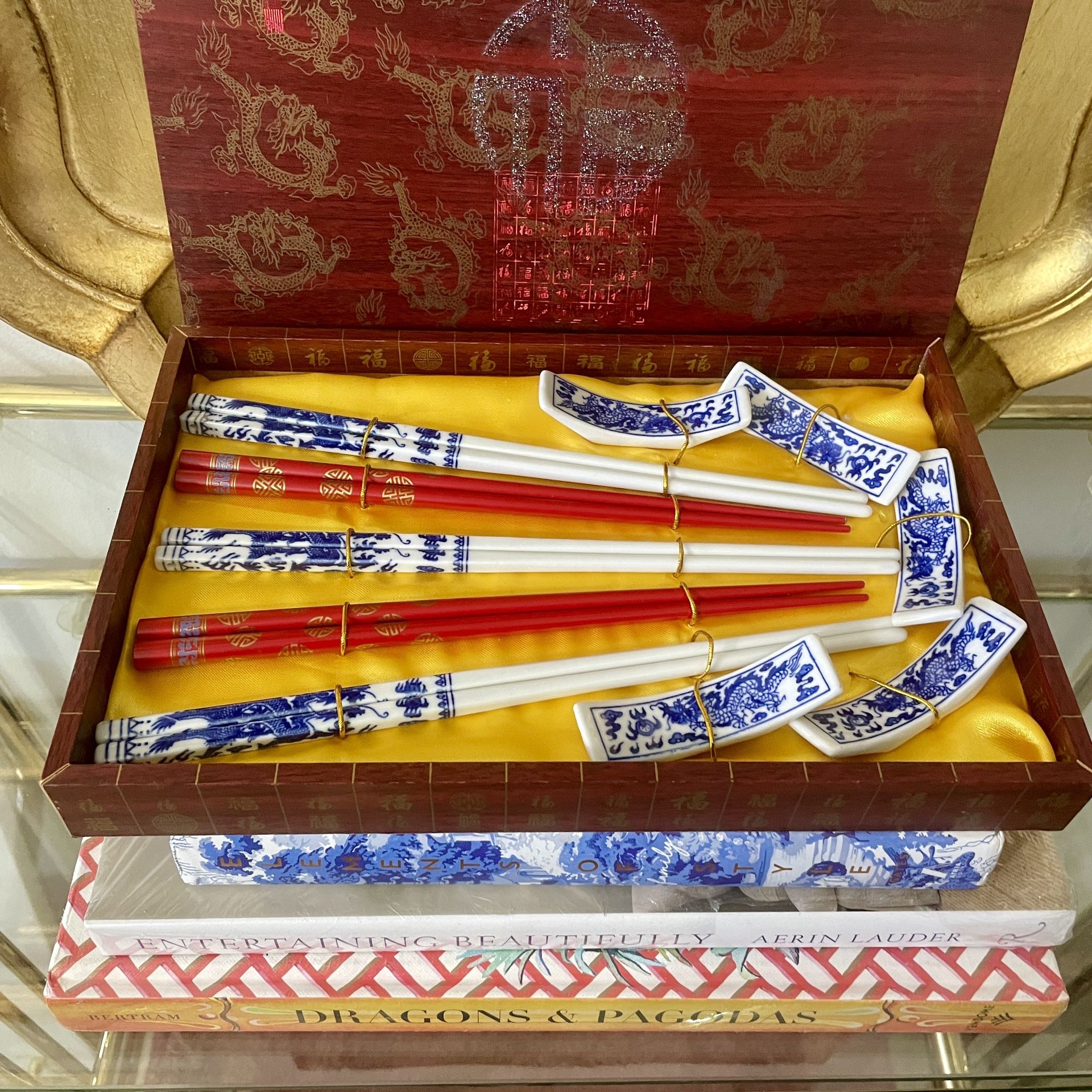 Bring the Year of the Dragon to your tablescape! This stunning chinoiserie dining set features three porcelain 9” L blue and white dragon motif chopsticks and two 8” L red wood chopsticks with a gold double happiness motif. Also included are five blue and white porcelain dragon rests, all housed inside a chinoiserie decorative box with a bold yellow lining. All pieces are in pristine condition with no damage and never used, despite being vintage. I could not find another set quite like this one online and it came from an estate, so it’s a truly rare find! Local pickup in St. Pete or I can ship. If meeting locally to pick up, I can accept cash, Venmo, PayPal or Zelle.