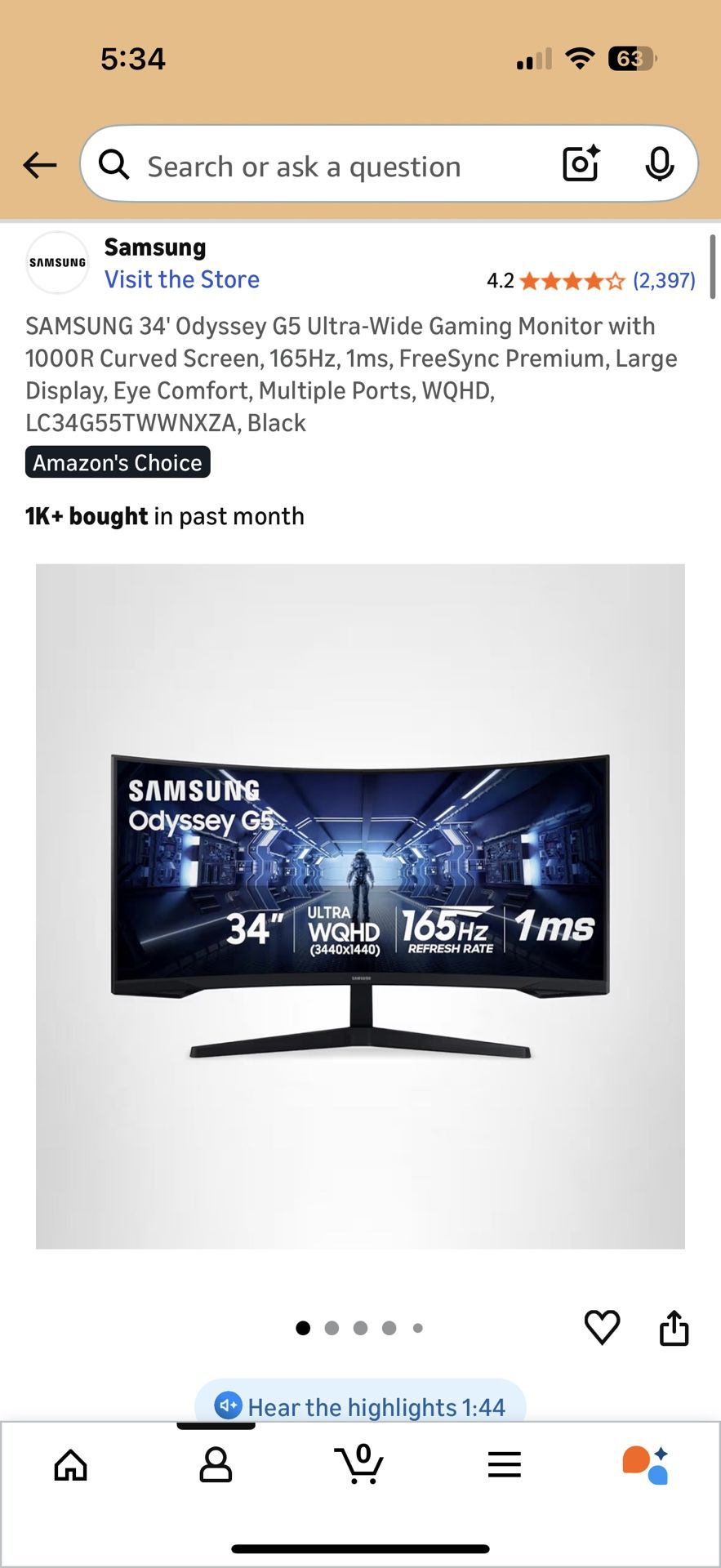 SAMSUNG 34' Odyssey G5 Ultra-Wide Gaming Monitor with 1000R Curved Screen, 165Hz, 1ms, FreeSync Premium, Large Display, Eye Comfort, Multiple Ports, WQHD, LC34G55TWWNXZA, Black Link: https://offerup.com/redirect/?o=aHR0cHM6Ly9hLmNvL2QvOVFaN0hDeA==