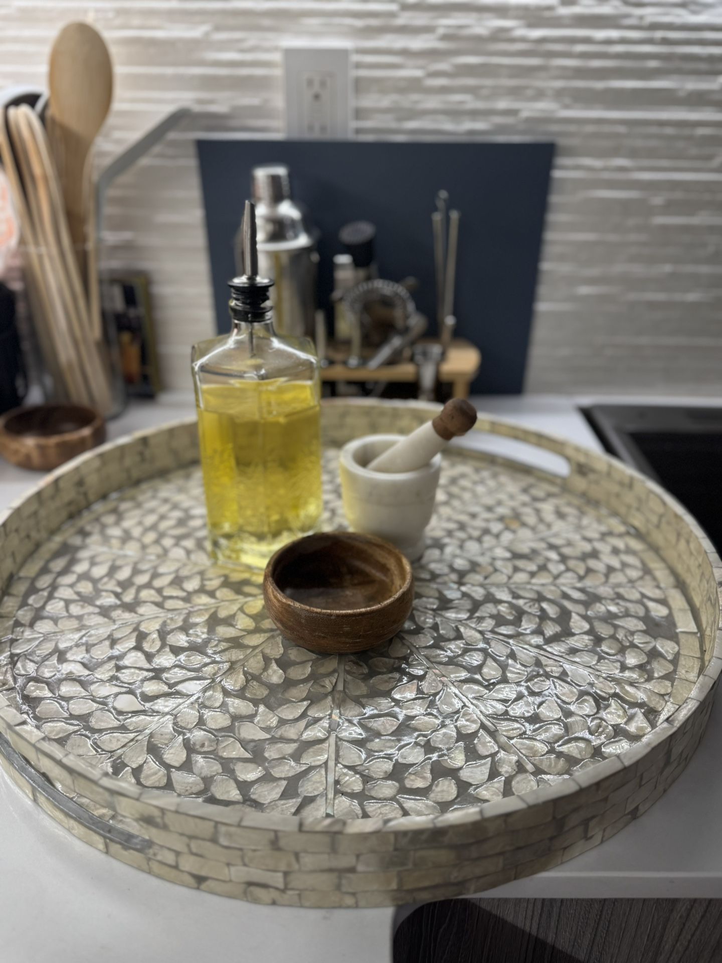 Serving tray with handles 19.5 inches. Perfect for dining, coffee table decoration, breakfast in bed etc. Lightly used as a night stand and decoration. Perfect condition!