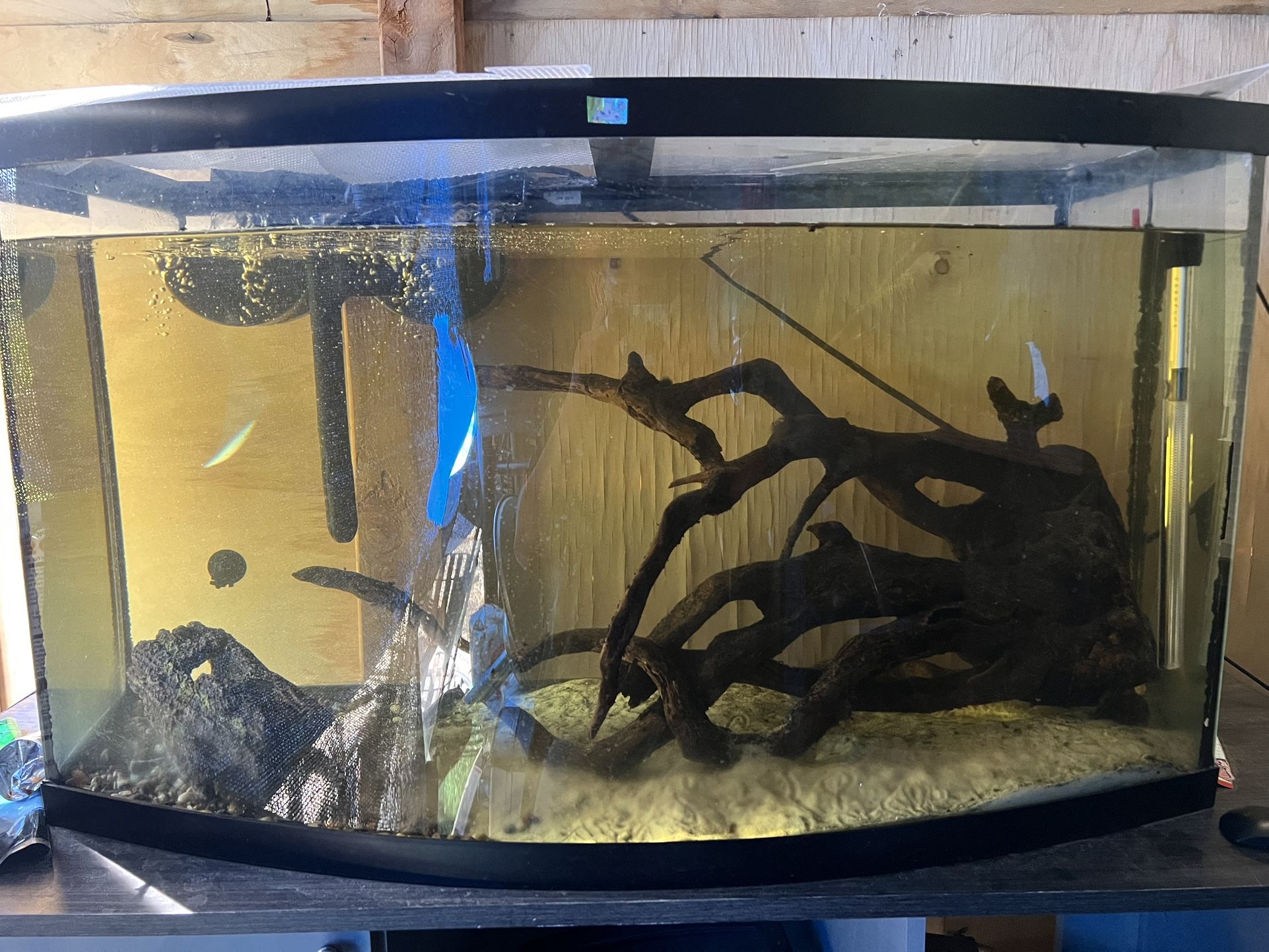 Bow front aquarium , drift wood, filter , heater. No negotiations . Would be down to trade for predator fish