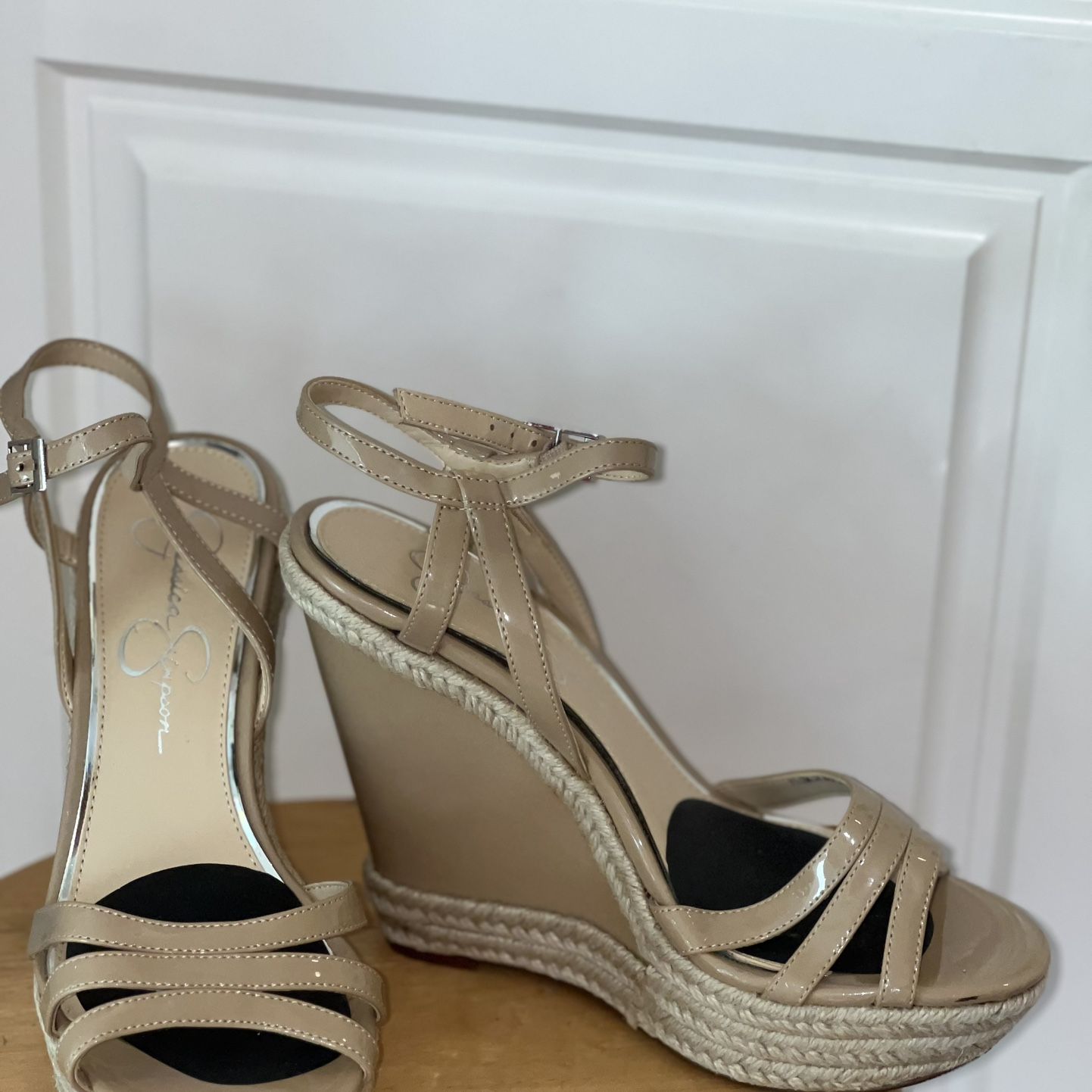 Jessica Simpson 7.5 wedge heel sandal, 5” LIKE NEW patent, tan / beige / neutral / natural color with woven fiber accent *note: check small inner flaw photo BEFORE purchasing - 1 spot as pictured Pick up in Palm Beach Gardens or Palm Coast or USF Tampa