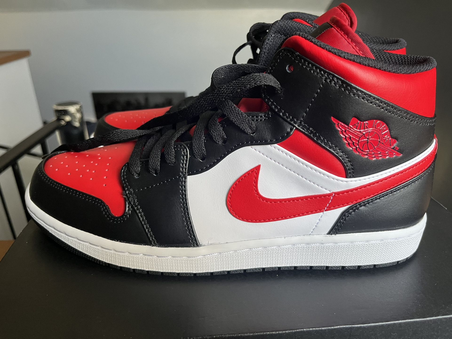 Brand new Air Jordan 1 mid. Never worn, still in the box. Black, Fire red, White colorway. Chicago Bulls style. Size 12. Clean colorway.