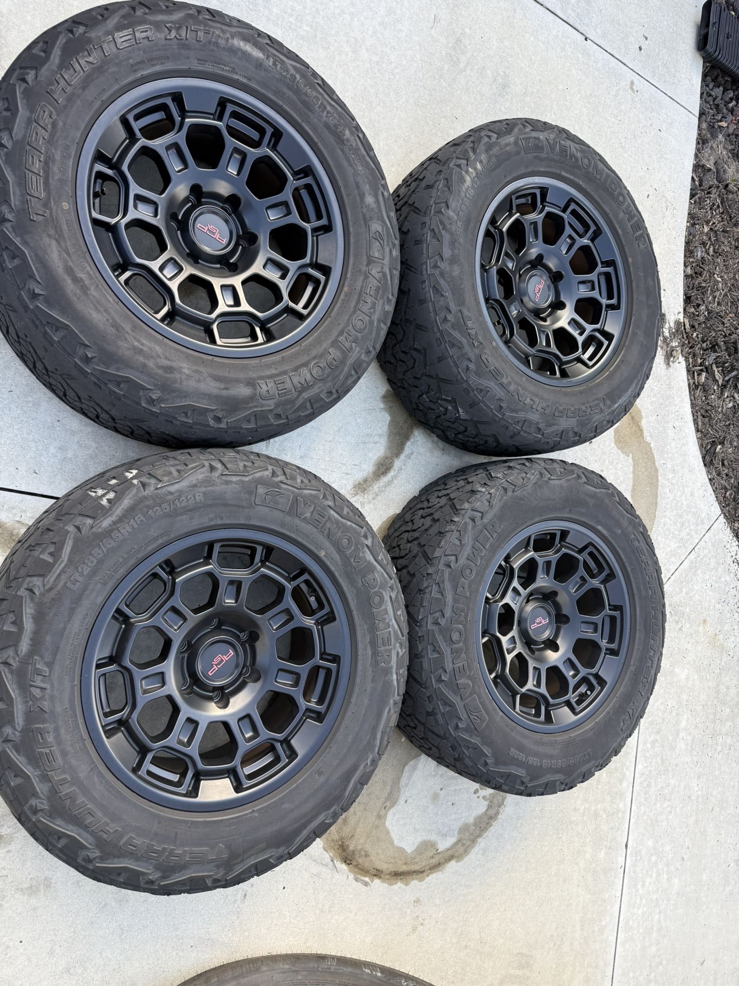 Aftermarket NON OEM 18” wheels/tires for 2023 Toyota Tundra. Wheels are in great shape but the tires have 30k miles on them and while still usable could definitely stand to be replaced. I have no idea what other vehicles these could fit I only know they were on my Tundra. No TPMS sensors. Serious buyers only no trades.