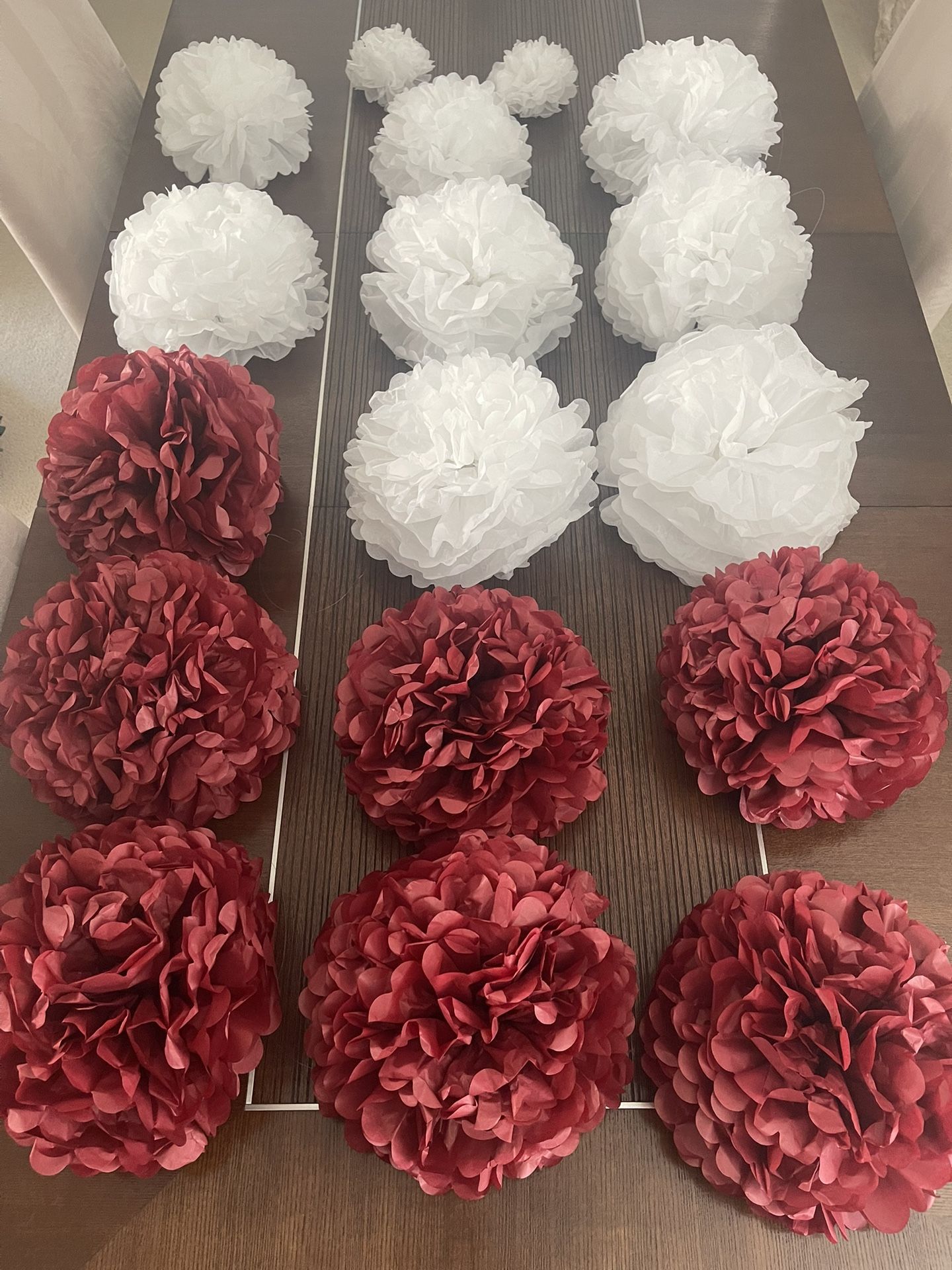 17 tissue POMPOMS, burgundy and white, New,perfect decor