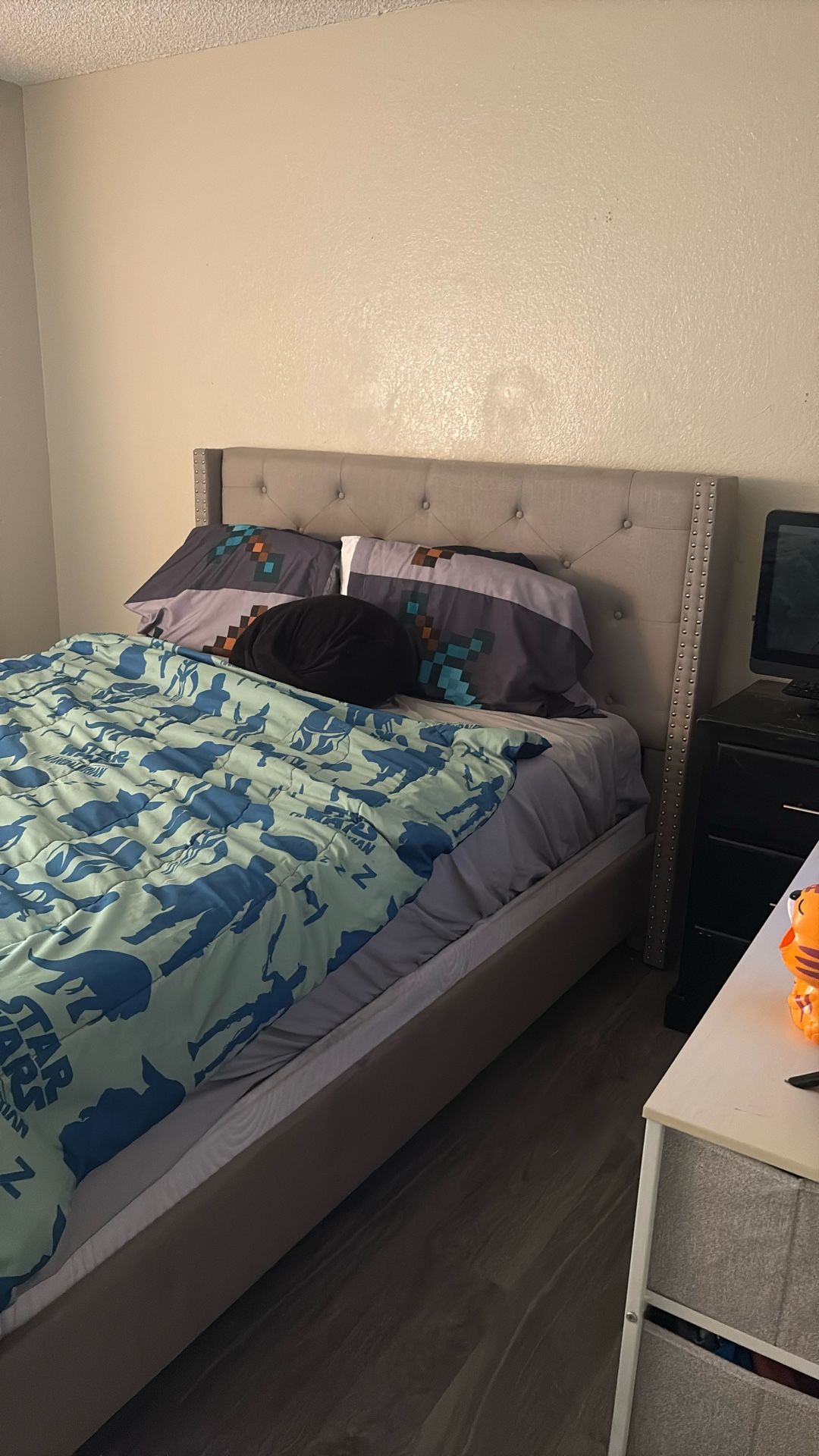 Grey studded bed frame Queen size Comes with mattress Foam mattress Moving/looking for a bunk bed for my kids