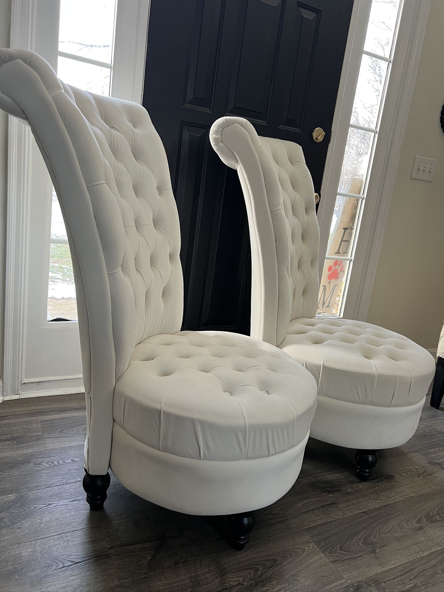 High Back Throne Royal Chair, Upholstered Velvet Tufted Chair, Beige Price is for the pair (2) Specifications: Color: Beige Overall Size: 24.6" x 32.3" x 46" Back Size: 24" x 28.3" Seat Size: 24" x 29.1" Leg Size: 3.5" x 6.7" Maximum Load: 330 lbs