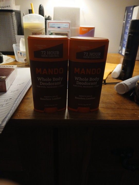 MANDO WHOLE BODY DEODORANT FOR PITS PACKAGES AND FEET....ALUMINUM FREE...72HR ODOR CONTROL....SMOOTH SOLID 2.6 OZ EACH....BOURBON LEATHER