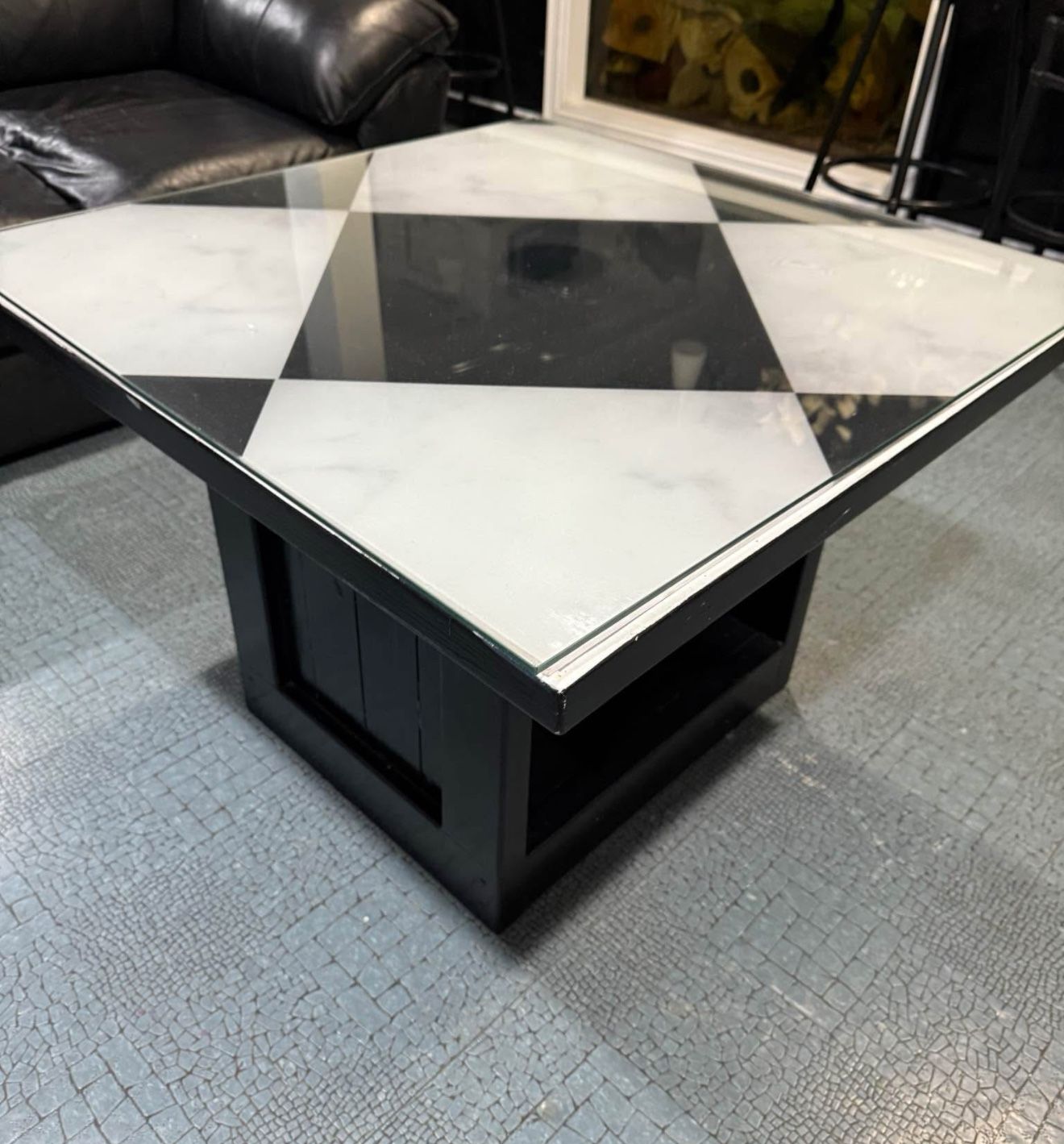 Stylish black wood table in good condition. The tabletop is removable. • Solid wood construction • Removable top to change style • regular wear but still looks great