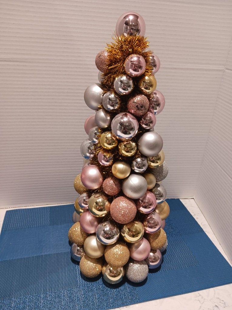 Merry Moments" Table Top Christmas Tree. The Ornaments Are A Mix Of Metallic And Glitter Finishes In Gold, Bronze, And Pinkish-Silver Tones. Tree Measures 16" Tall.