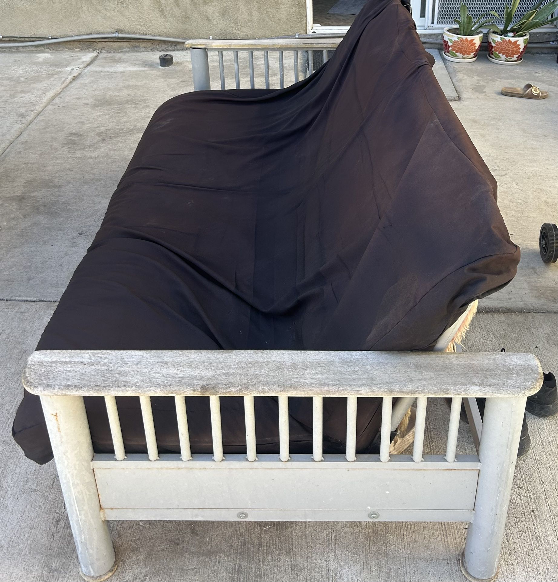 No holds just need to get rid of it asap $50 OBO open to all offers This is for the futon frame I’ve had it in the backyard for about 3 months since I moved it from indoors. Good condition just needs a quick cleaning since it’s been in the wind outside and gets dusty. The black mattress looking thing is not its mattress, it’s just a makeshift mattress I made to use outside. It can come with the frame or I’ll just dispose it.
