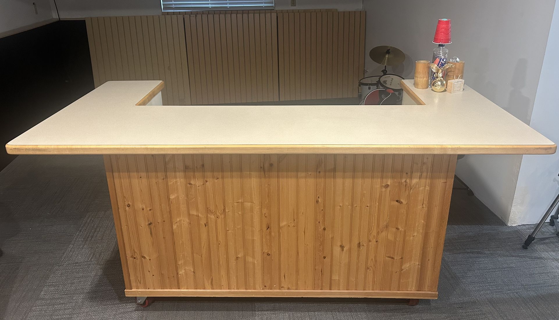 Custom bar for sale! On heavy duty casters for easy movement. The bar top can be screwed on and off to fit through doors easily. Has an outlet installed and holes to hide the cords. In great condition with plenty of storage $250 OBO Can deliver for a small fee.