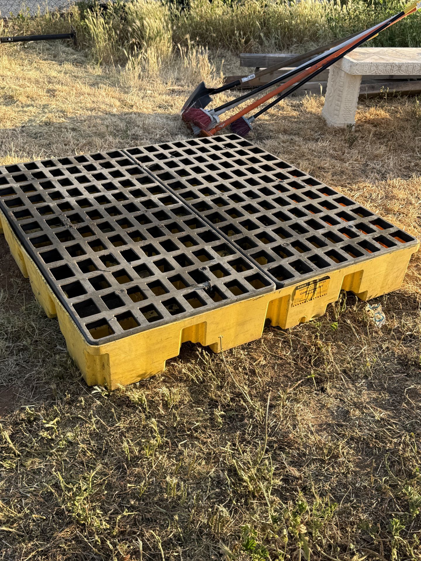 Heavy-duty Eagle 4 drum spill containment pallet. Designed for 55-gallon drums, chemical resistant. Great for shop, warehouse, or industrial use. Used but fully functional. Located in Riverside