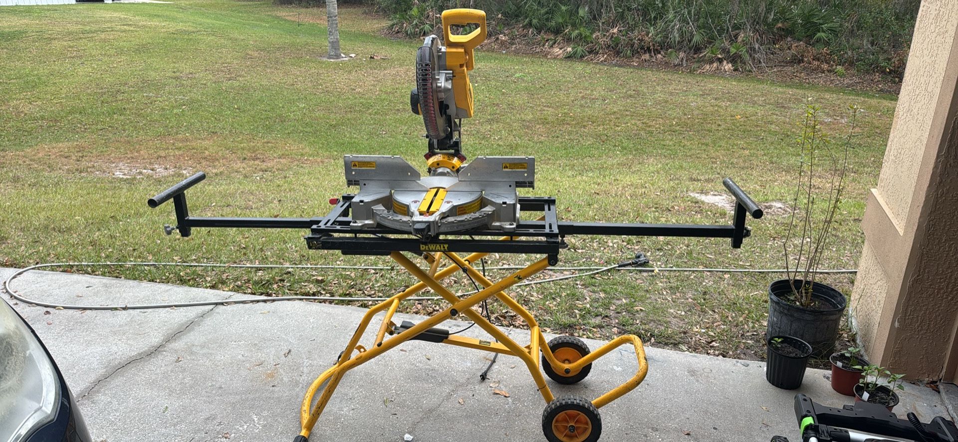 Dewalt DWS716 12' double bevel compound miter saw with DWX726 rolling miter saw stand.Strong motor, good saw. Stand is very convenient and easy to move around and store saw out of the way when not in use. 300lb capacity.