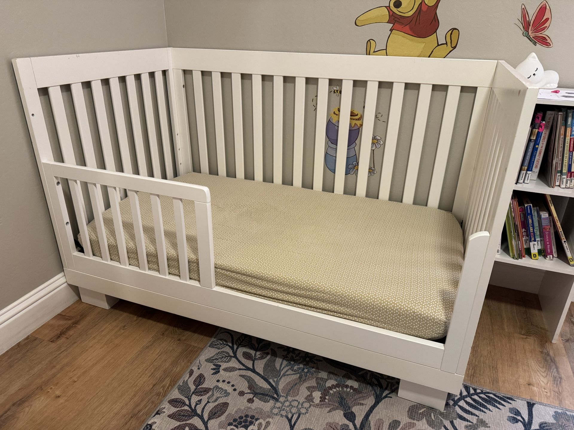 For sale: Babyletto Modo 3-in-1 Baby Crib Convertible to Toddler Bed & Daybed - Includes Toddler Conversion Kit - GREENGUARD Gold Certified - 100% Solid Wood Crib for Baby - 4 Adjustable Heights - White Condition : Used . Small scratches(can be done with touch up) Includes: conversion kit and side panel, mattress